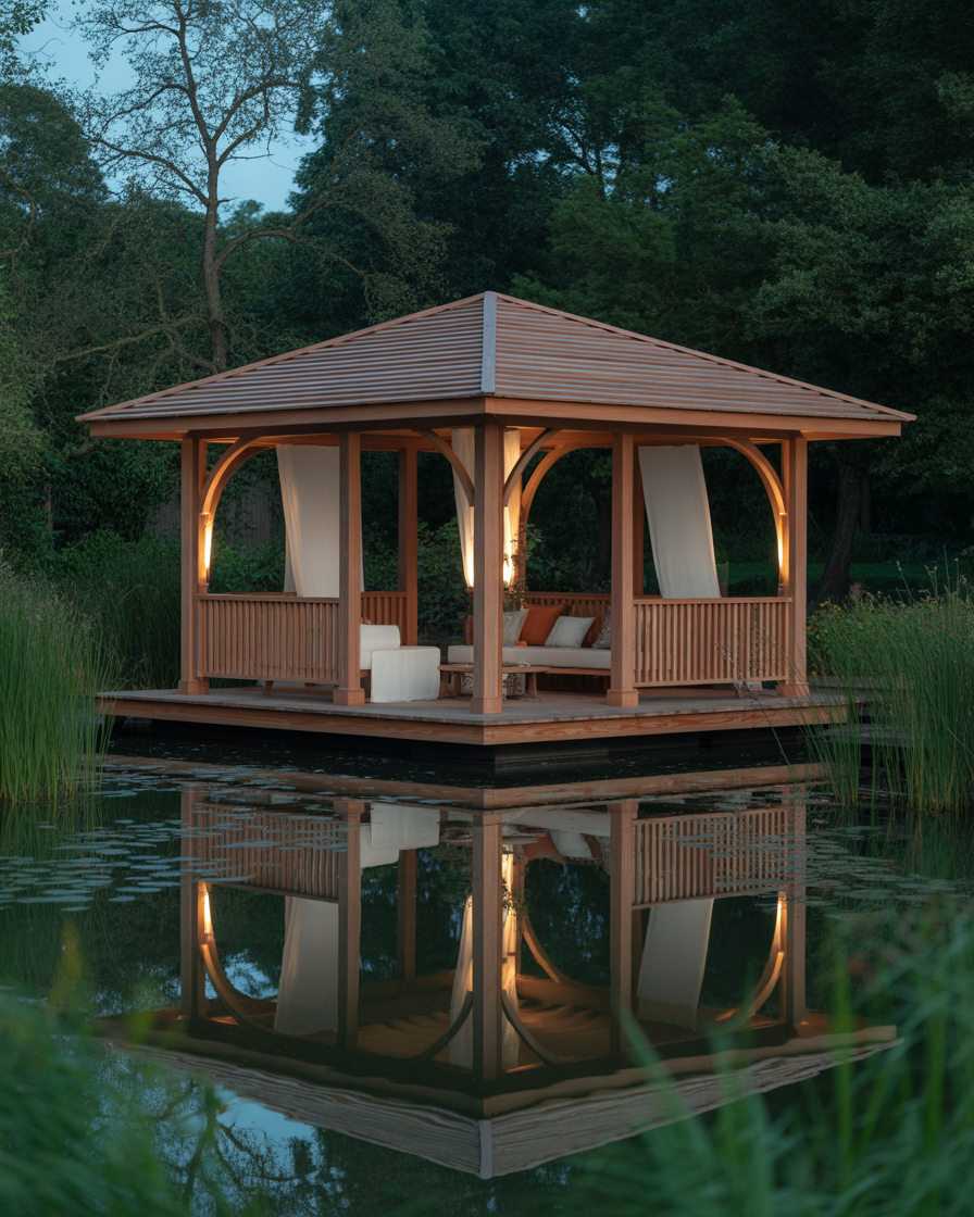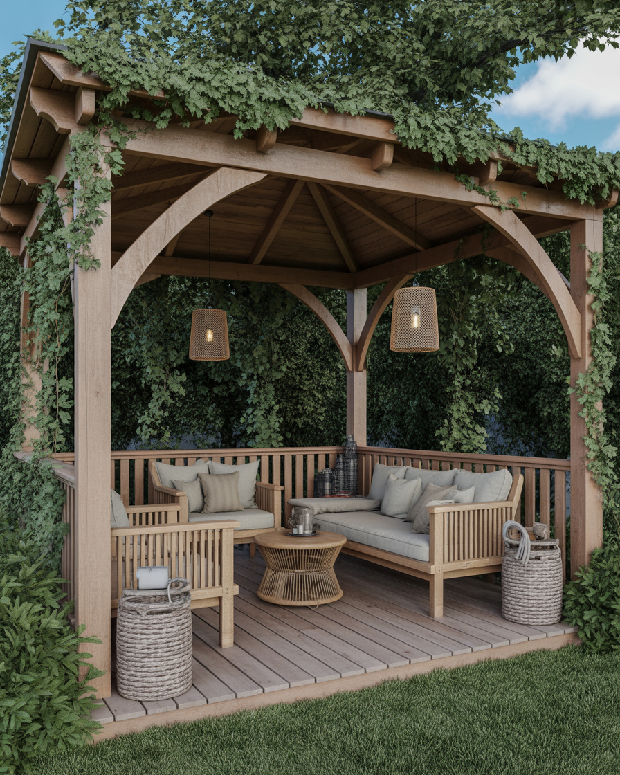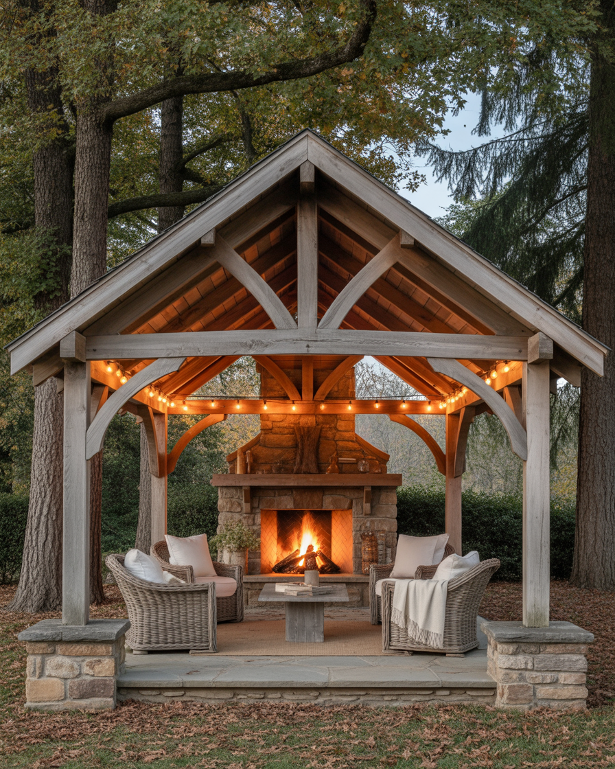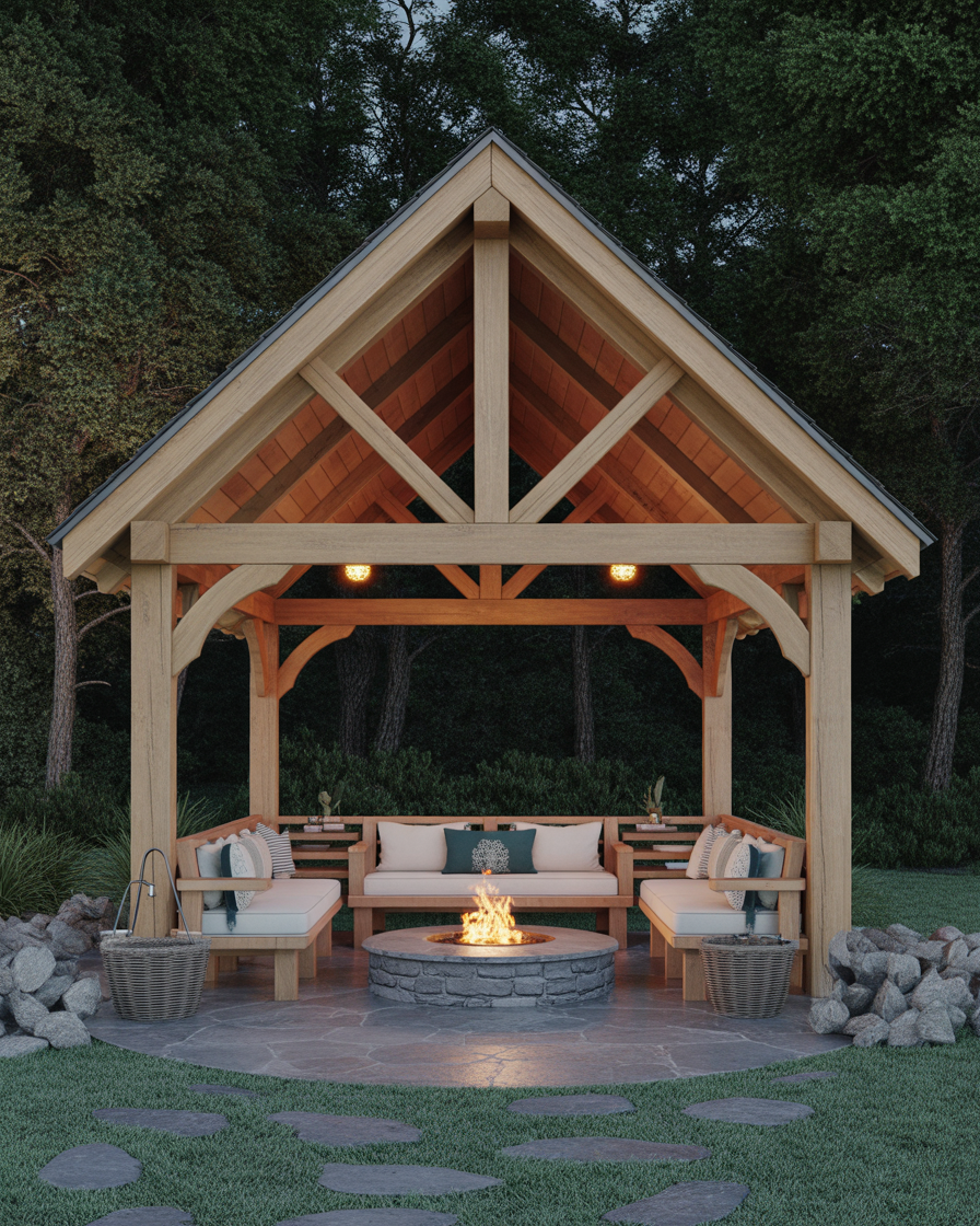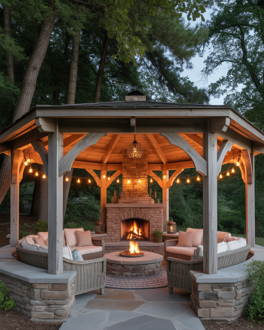 Nothing feels more inviting than a wooden gazebo paired with a glowing fire pit. This outdoor setup is ideal for gathering with friends or enjoying peaceful evenings under the stars. Natural materials like cedar beams and stone bases enhance the rustic charm, while warm lighting and throws make it perfect for year-round comfort.