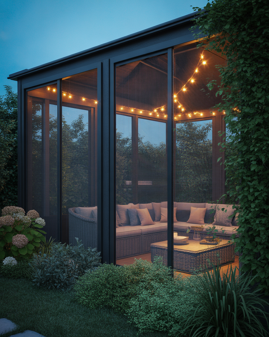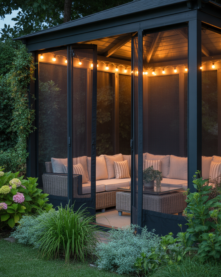 A screened gazebo provides the perfect balance between openness and protection. Its outdoor enclosed design lets you enjoy warm summer nights without the bugs. Add hanging lanterns and soft cushions to create a charming, breezy space for family dinners or quiet relaxation.