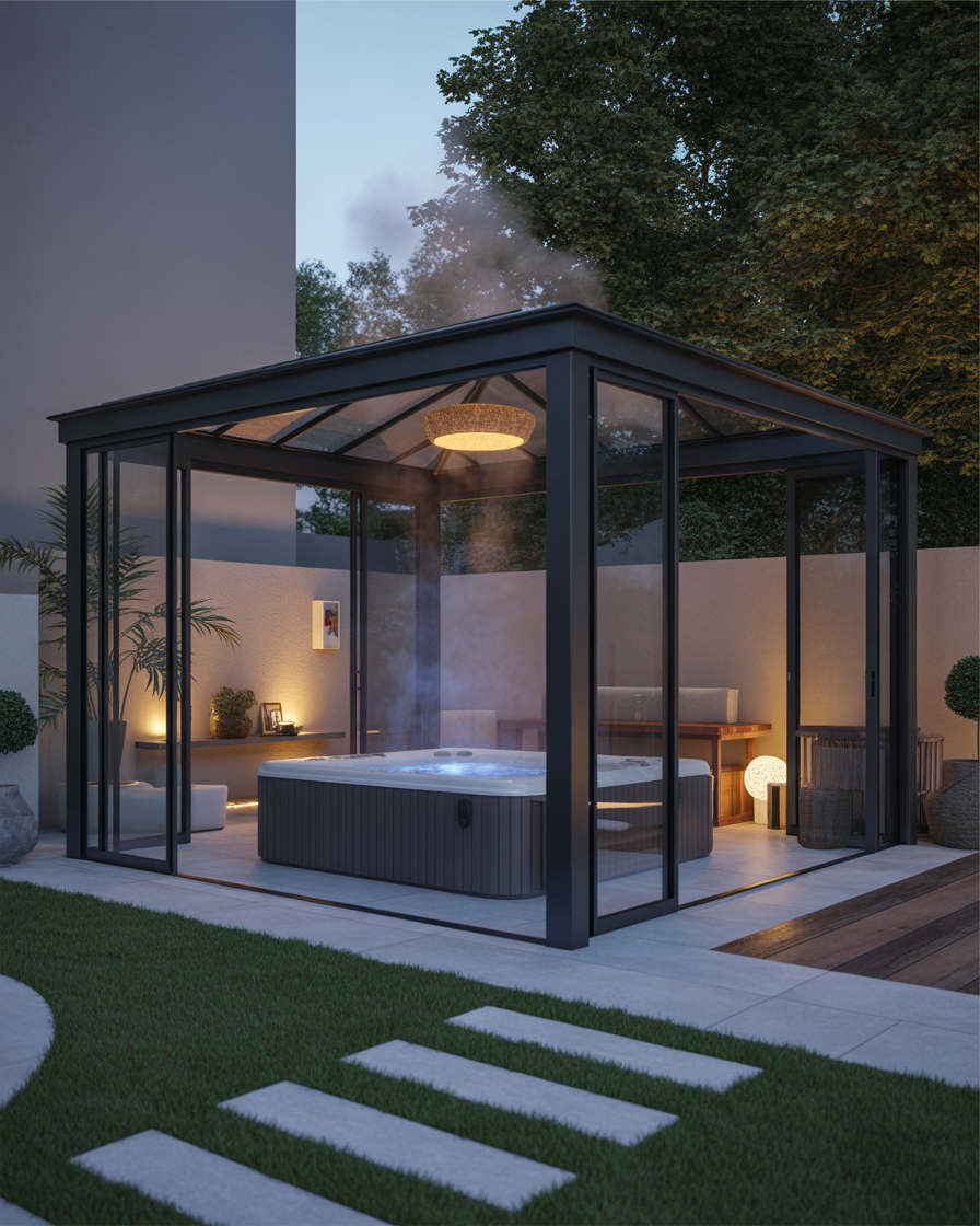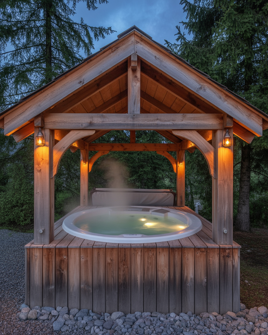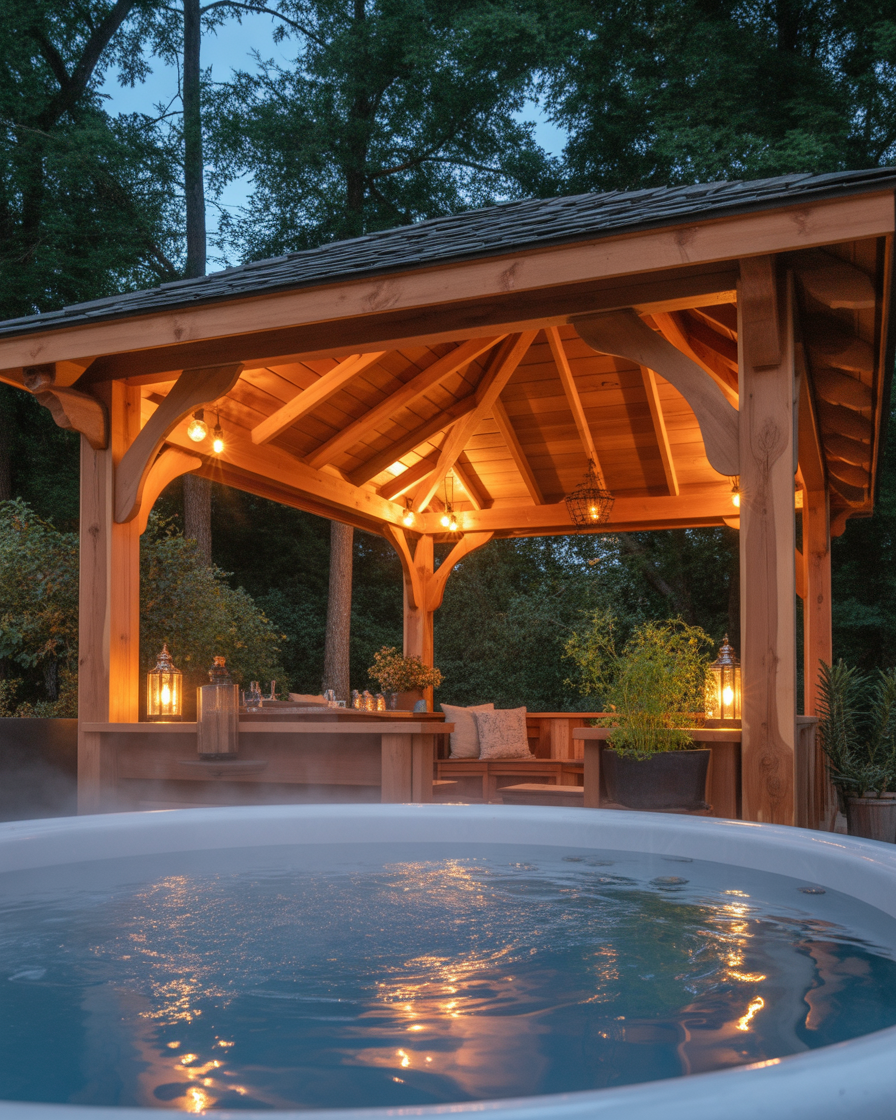 For those who want a spa-like retreat, a hot tub inside a covered gazebo provides the perfect balance of luxury and privacy. The enclosed setting shields from the wind while keeping it cozy. Add candles or soft lighting to elevate your evening unwind ritual.