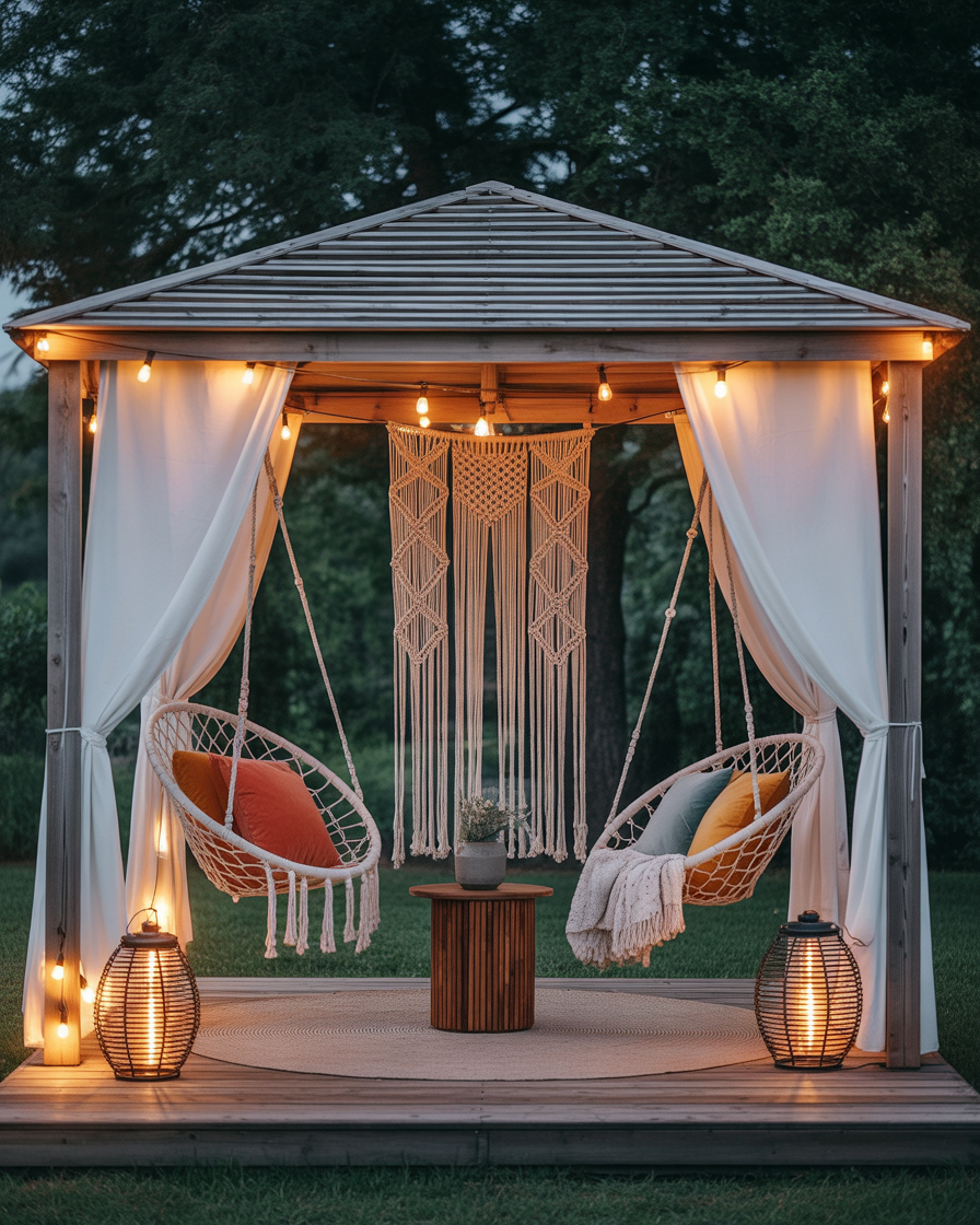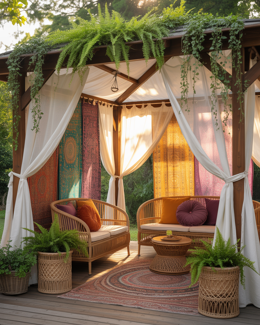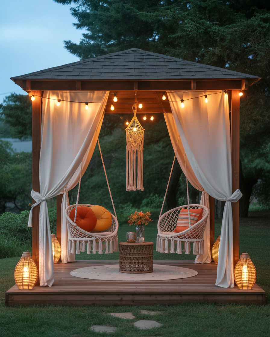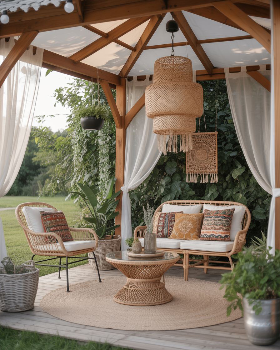 Bring personality to your outdoor area with a boho gazebo filled with vibrant cushions, hanging plants, and layered rugs. Natural textures and soft fabrics give it a relaxed, free-spirited charm. It’s the perfect backdrop for lazy summer afternoons or creative outdoor gatherings.