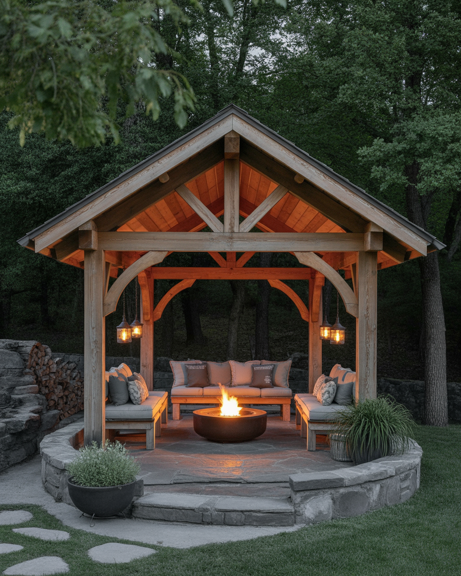 Rustic Wooden Gazebo with a Cozy Fire Pit