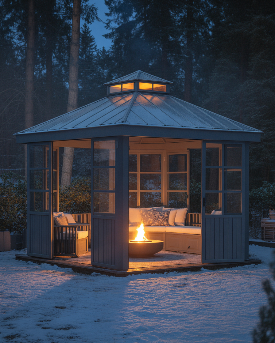 An outdoor enclosed gazebo with glass or vinyl panels lets you enjoy your backyard all year long. It keeps you warm in winter and shaded in summer. Add a small fire pit, heaters, or cozy blankets to turn it into a personal retreat no matter the season.