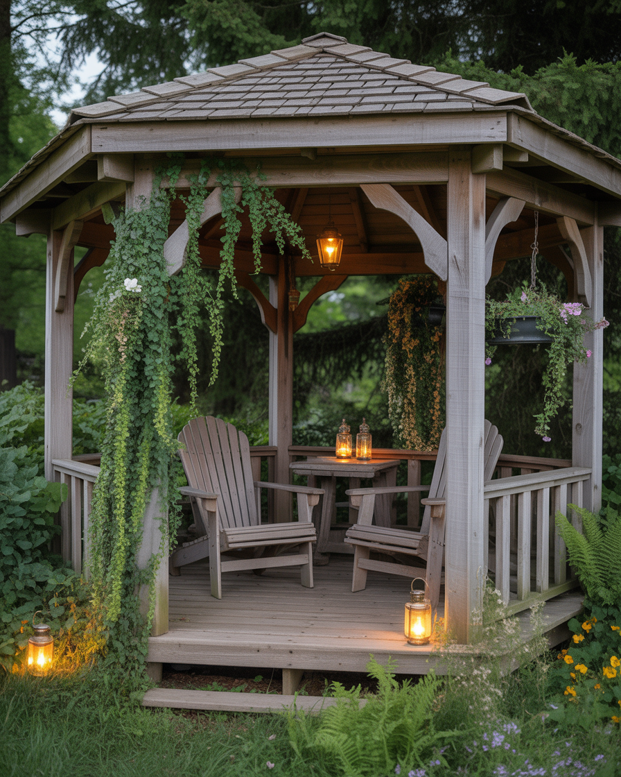 Transform a quiet corner of your backyard into a peaceful hideaway with a wooden gazebo. Its rustic charm blends beautifully with natural landscapes. Decorate with climbing vines, lanterns, and wooden chairs for a perfect mix of simplicity and comfort.