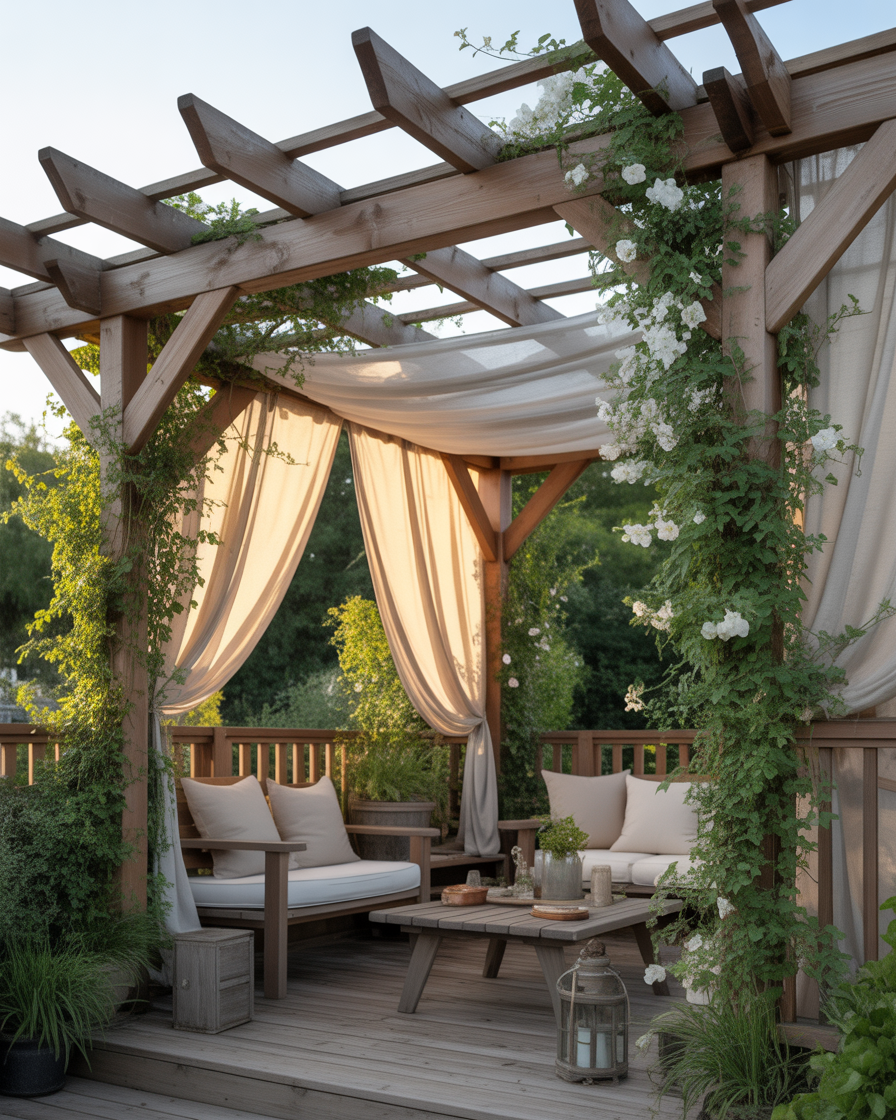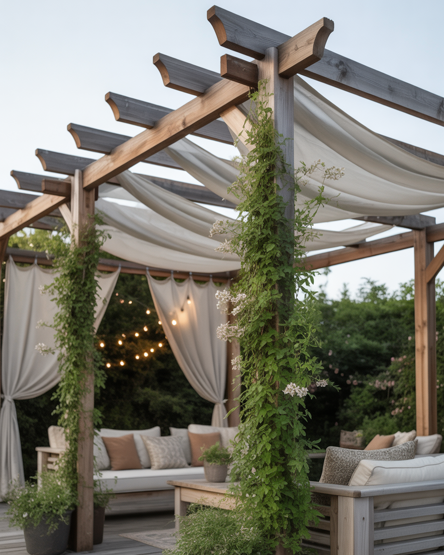 For a quick and cheap backyard makeover, a pergola-style DIY gazebo made of wood beams and climbing plants delivers stunning results. It’s simple, airy, and budget-friendly—a perfect project for beginners looking to enhance their space.
