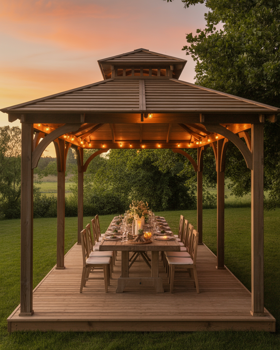 A large rustic gazebo built from solid wood is the perfect centerpiece for family celebrations. With space for tables, benches, and décor, this outdoor retreat combines strength with warmth. String lights or hanging planters add festive charm, making it ideal for year-round use.