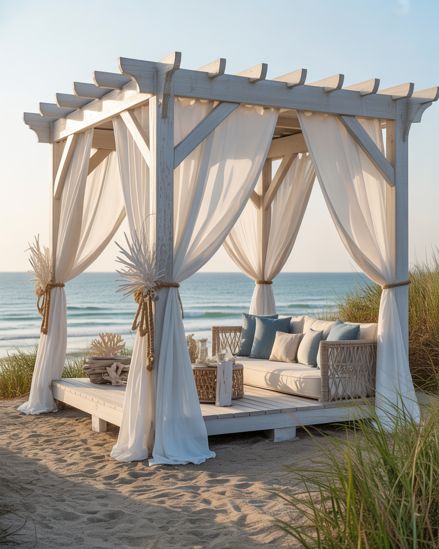 A white coastal gazebo brings breezy beach charm to any yard. Light fabrics, pale wood, and soft textures capture the ocean’s tranquility. It’s ideal for summer relaxation and pairs beautifully with rattan furniture and seashell décor.