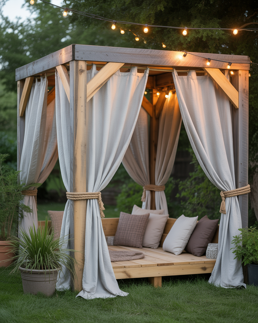 A DIY gazebo is the perfect weekend project for anyone working with a cheap budget. Using reclaimed wood, fabric drapes, or even pallet flooring, you can design a cozy space that’s as personal as it is affordable. This simple yet creative setup turns any yard into a warm, welcoming retreat.