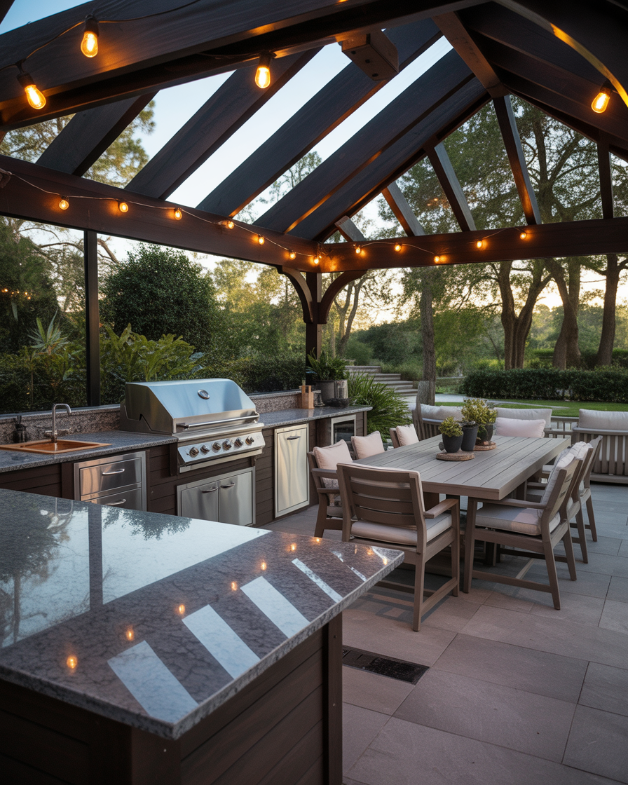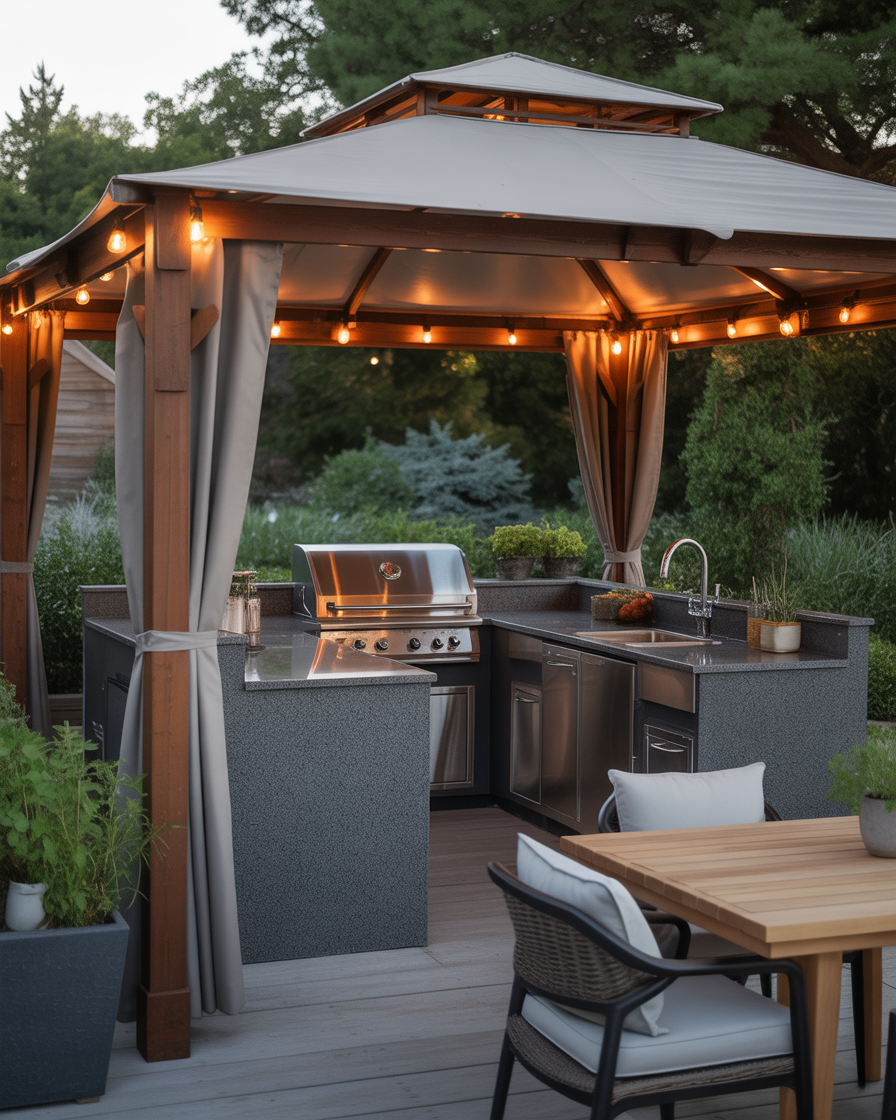 The ultimate outdoor kitchen experience starts with a covered gazebo. It’s a functional extension of your home—perfect for grilling, cooking, and entertaining. Add stone countertops, a bar area, and pendant lighting for a sophisticated yet cozy outdoor dining atmosphere.