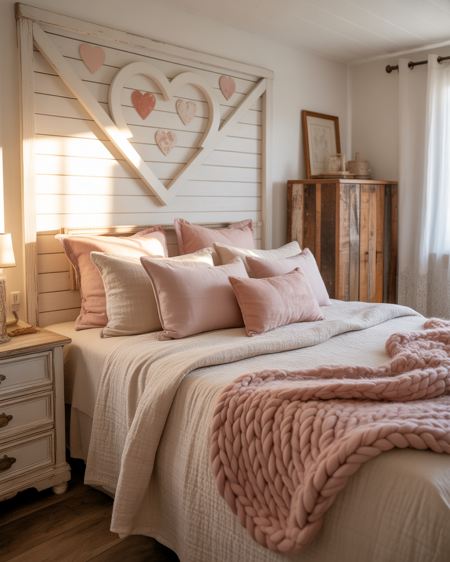 A sweet upgrade for master bedrooms is a subtle DIY accent wall. Try removable decals or a painted pattern of soft blush hearts. Pair this with linen bedding, wooden art pieces, and neutral tones to keep things cozy yet tasteful — a refreshing twist on Valentine’s charm.