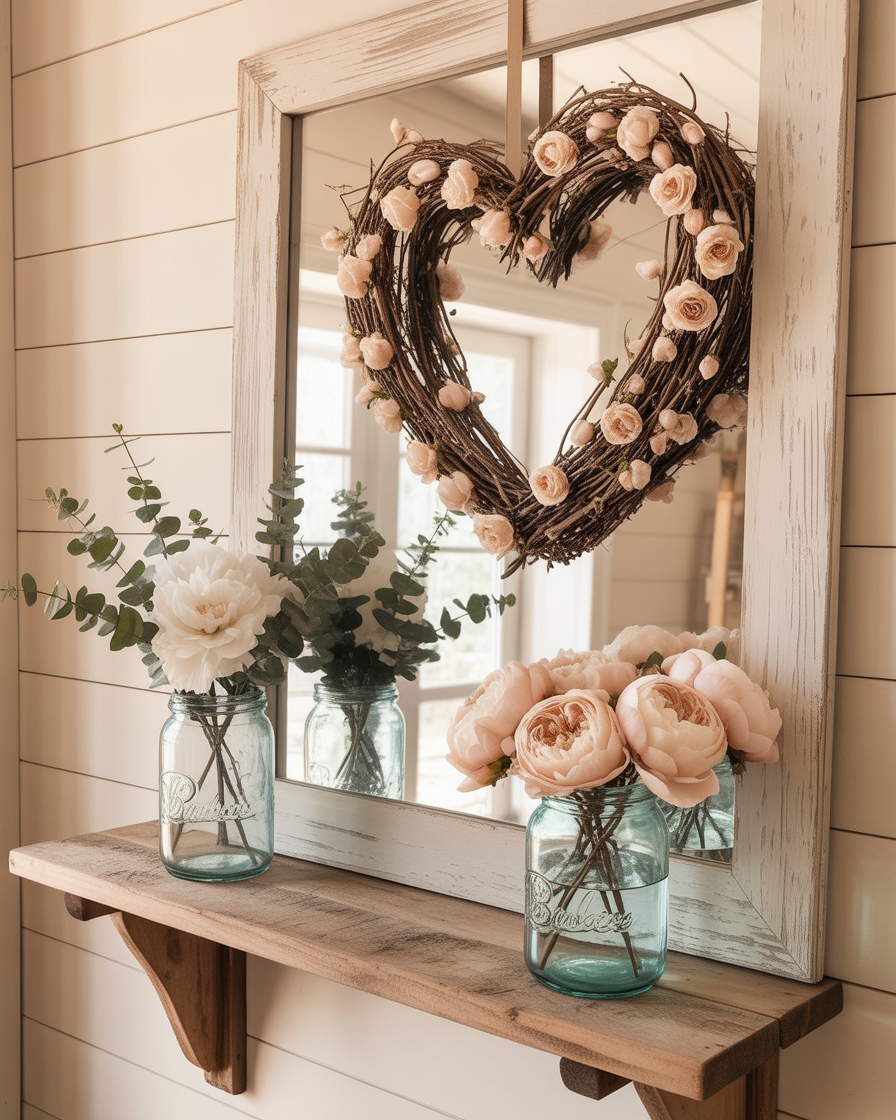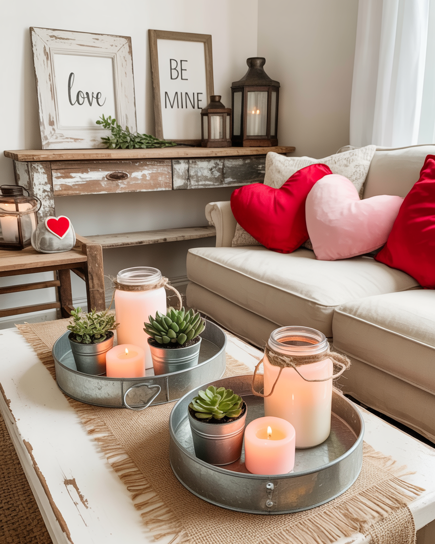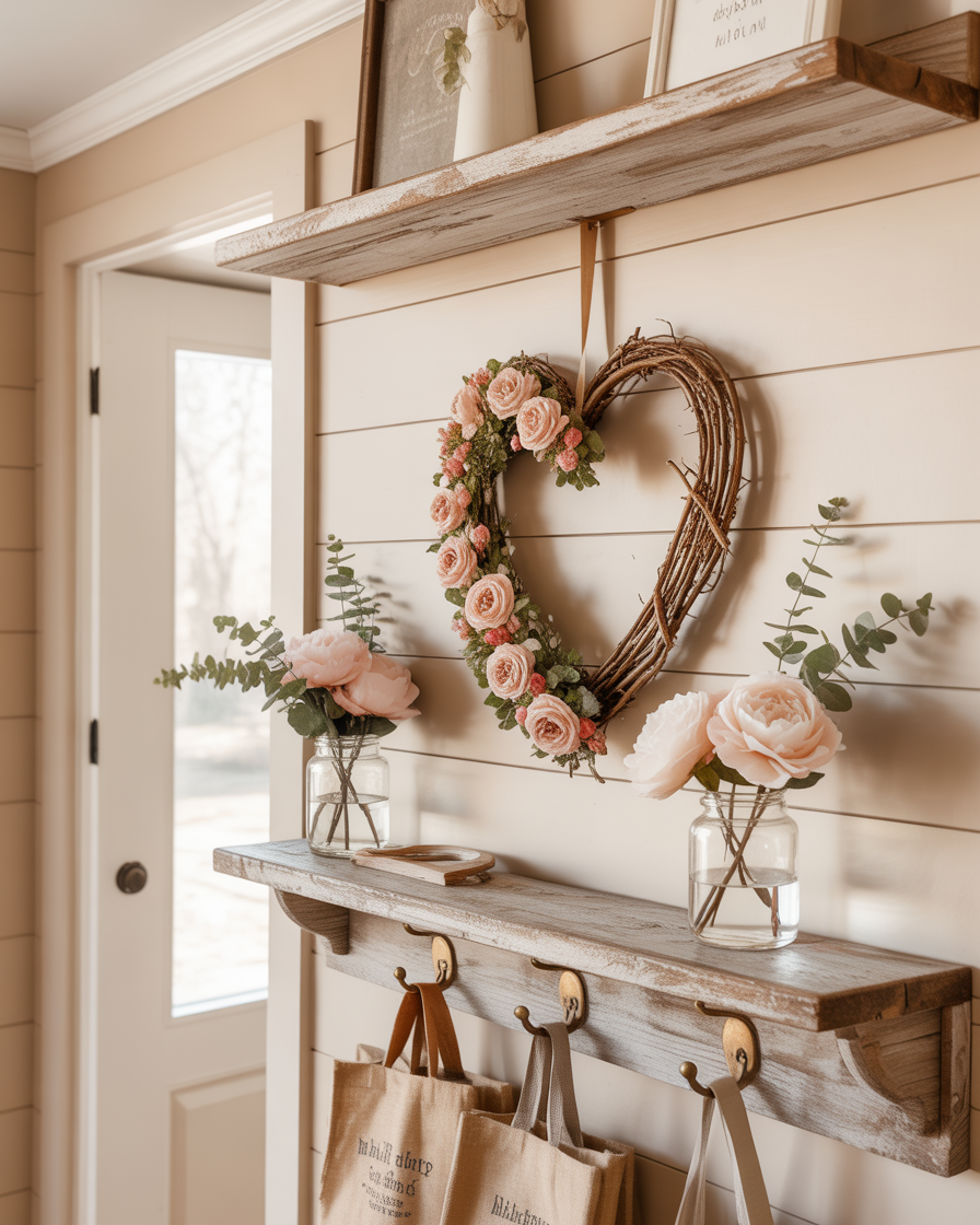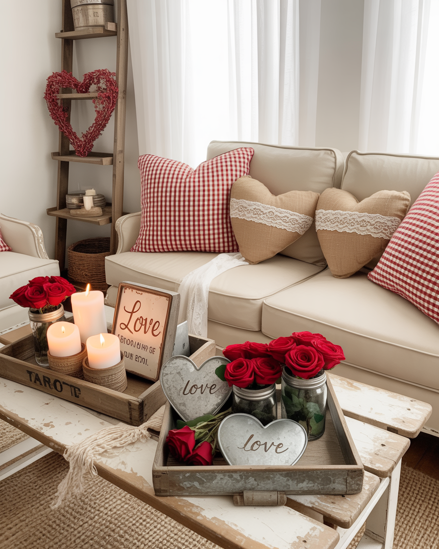Set the tone right at the entrance with a charming rustic Valentine’s display. Use distressed wood shelves for seasonal decorative trays, small heart signs, and floral wreaths garlands. A soft neutral color palette of white, blush, and beige keeps the country vibe balanced while making the space feel light and loving.