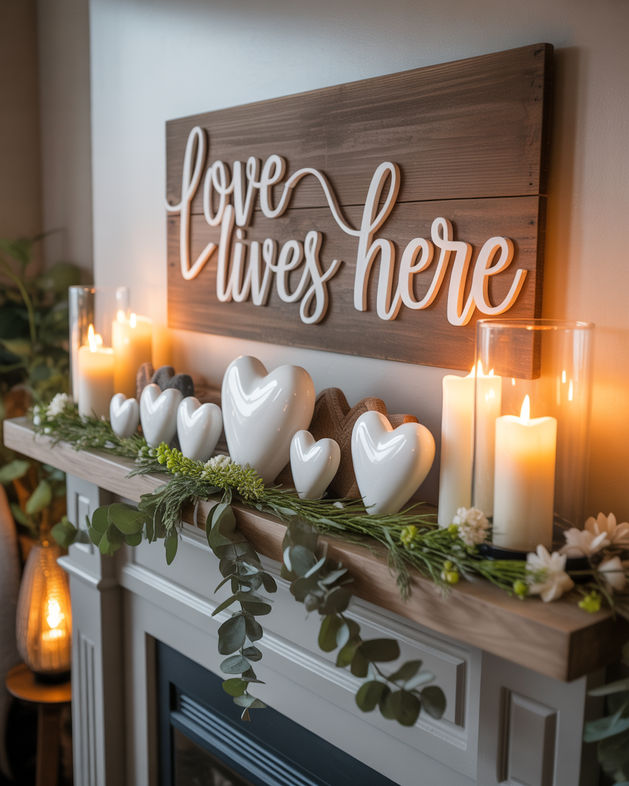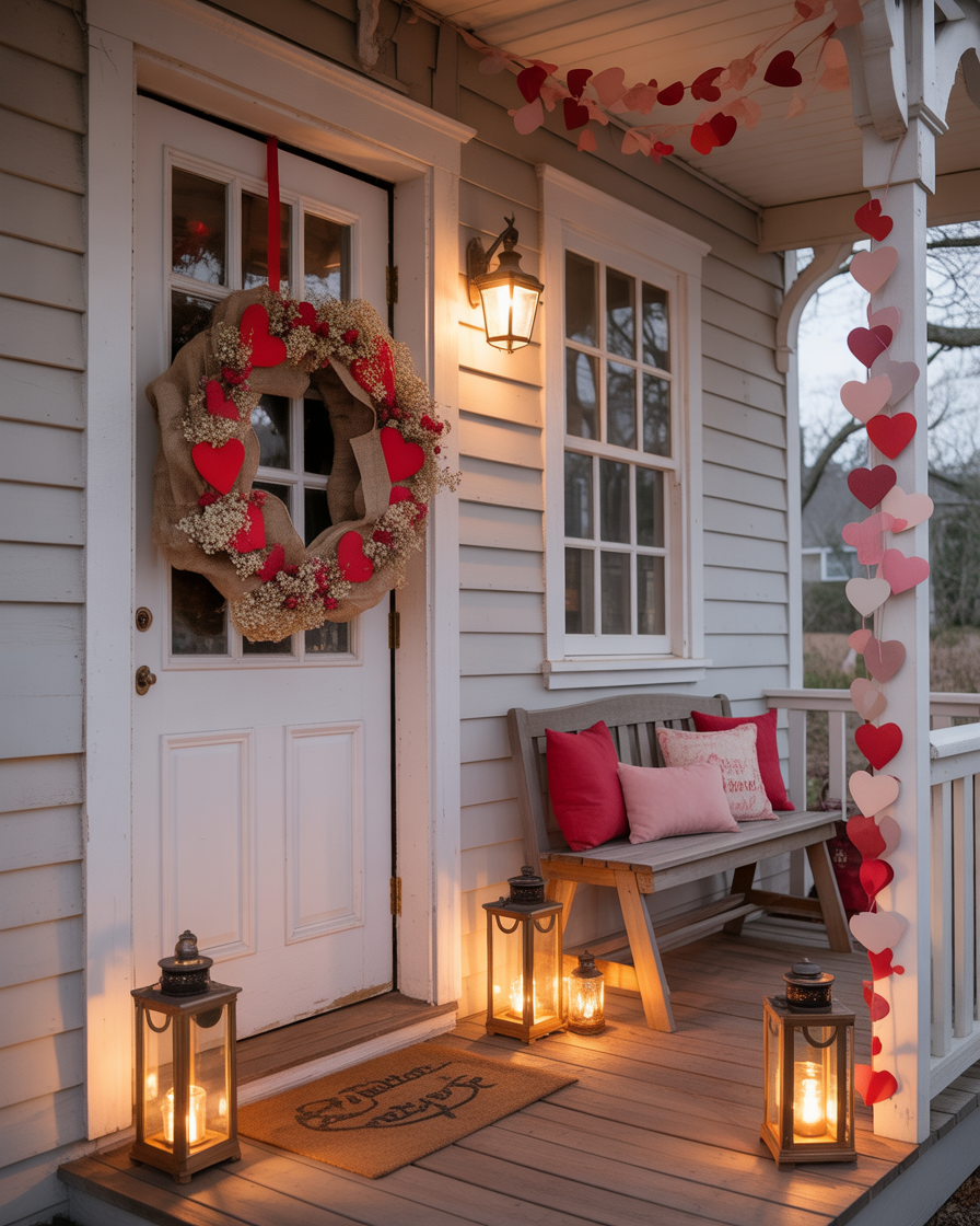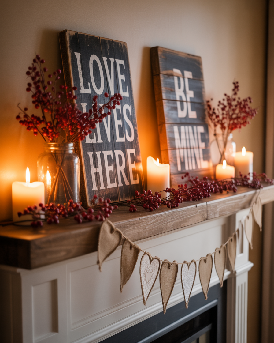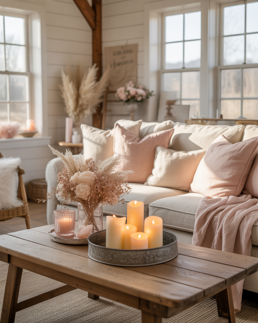 Set the tone right at the entrance with a charming rustic Valentine’s display. Use distressed wood shelves for seasonal decorative trays, small heart signs, and floral wreaths garlands. A soft neutral color palette of white, blush, and beige keeps the country vibe balanced while making the space feel light and loving.