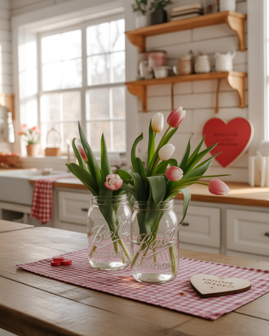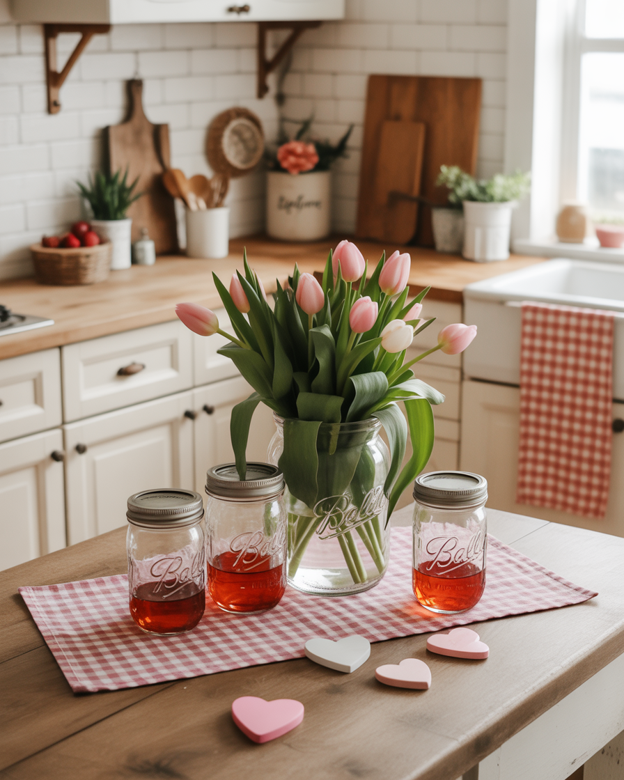 A kitchen filled with DIY crafts can be the heart of your Valentine’s celebration. Use wooden heart garlands, mason jars filled with tulips, and a gingham tablecloth for a cozy country feel. Affordable finds from Target or Walmart can add finishing touches, making it look handcrafted and homey without breaking the bank.