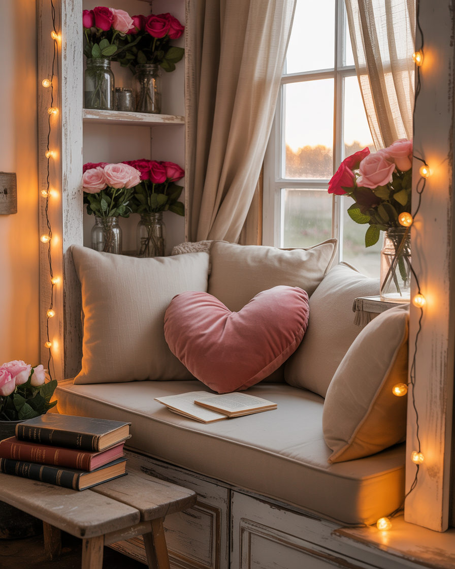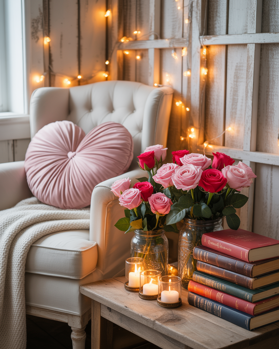 Turn a corner into a warm Valentine retreat using DIY touches — a chunky knit throw, vintage books, and a small side table decorated with roses. Add string lights and a soft heart pillow for a relaxed French country atmosphere that invites connection and calm.
