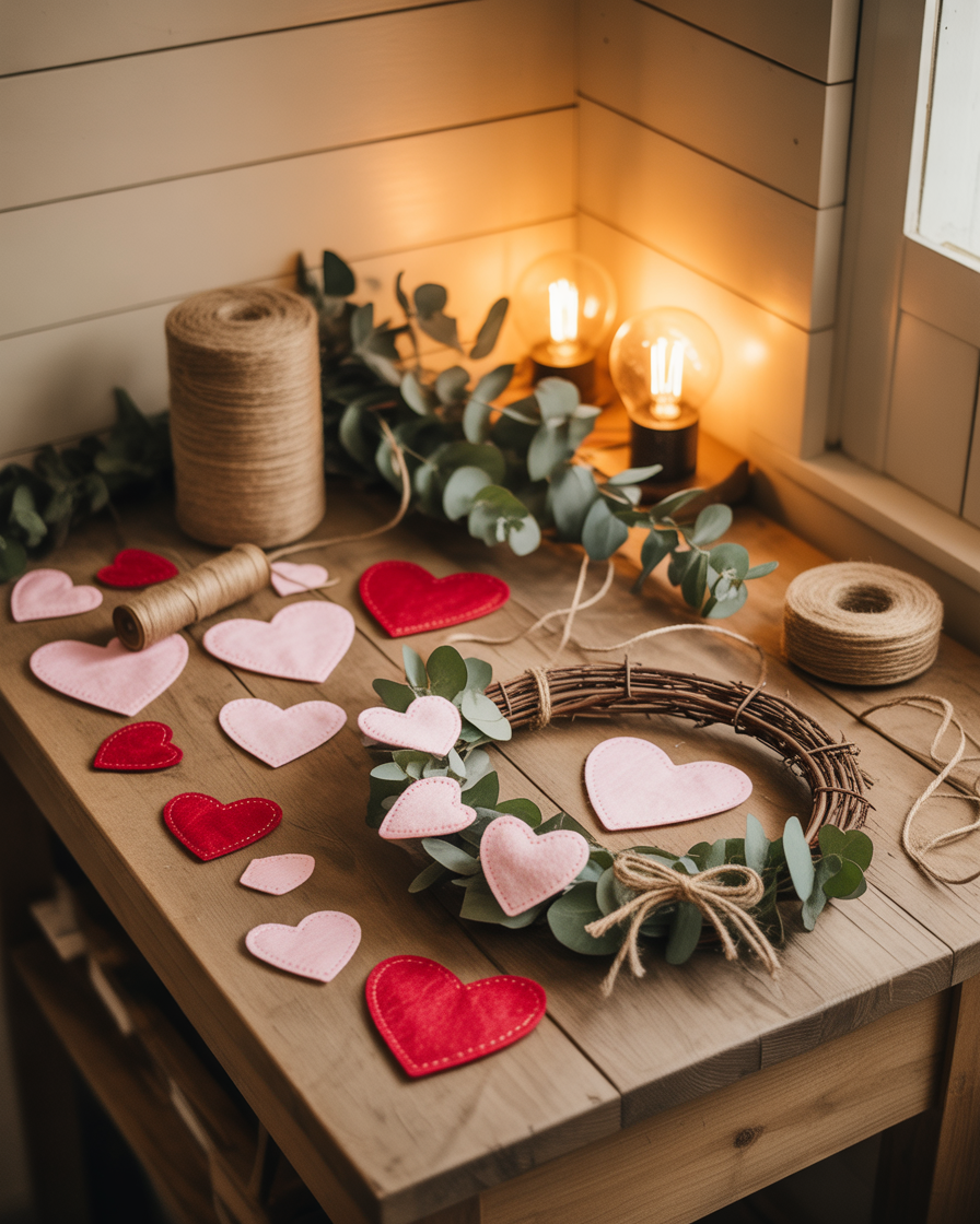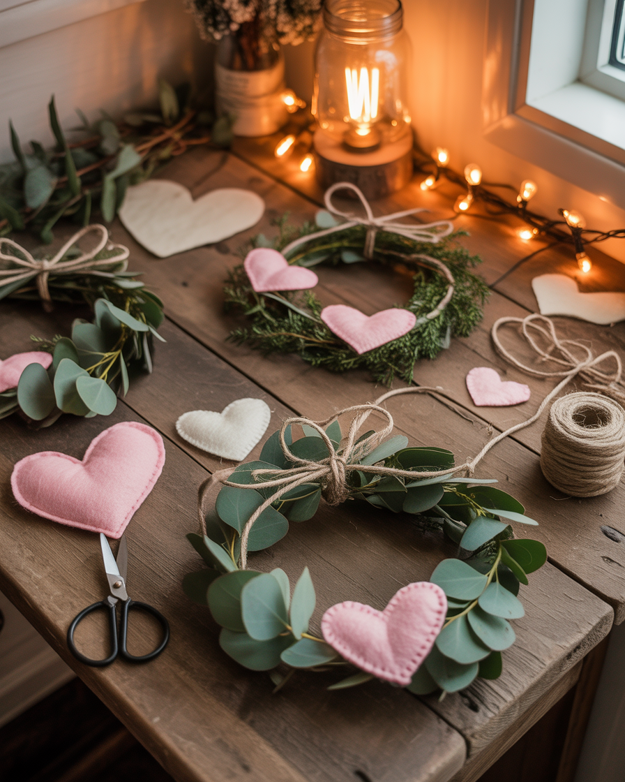 Setting up a small DIY crafts corner is a fun way to personalize your farmhouse space. Create wreaths garlands using twine, felt hearts, and eucalyptus stems. These handmade accents are perfect for the kitchen, entryway, or even your mantle, adding authenticity and warmth to your Valentine look.