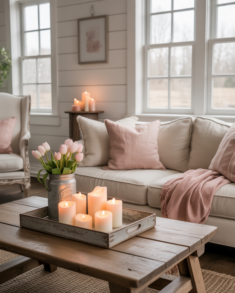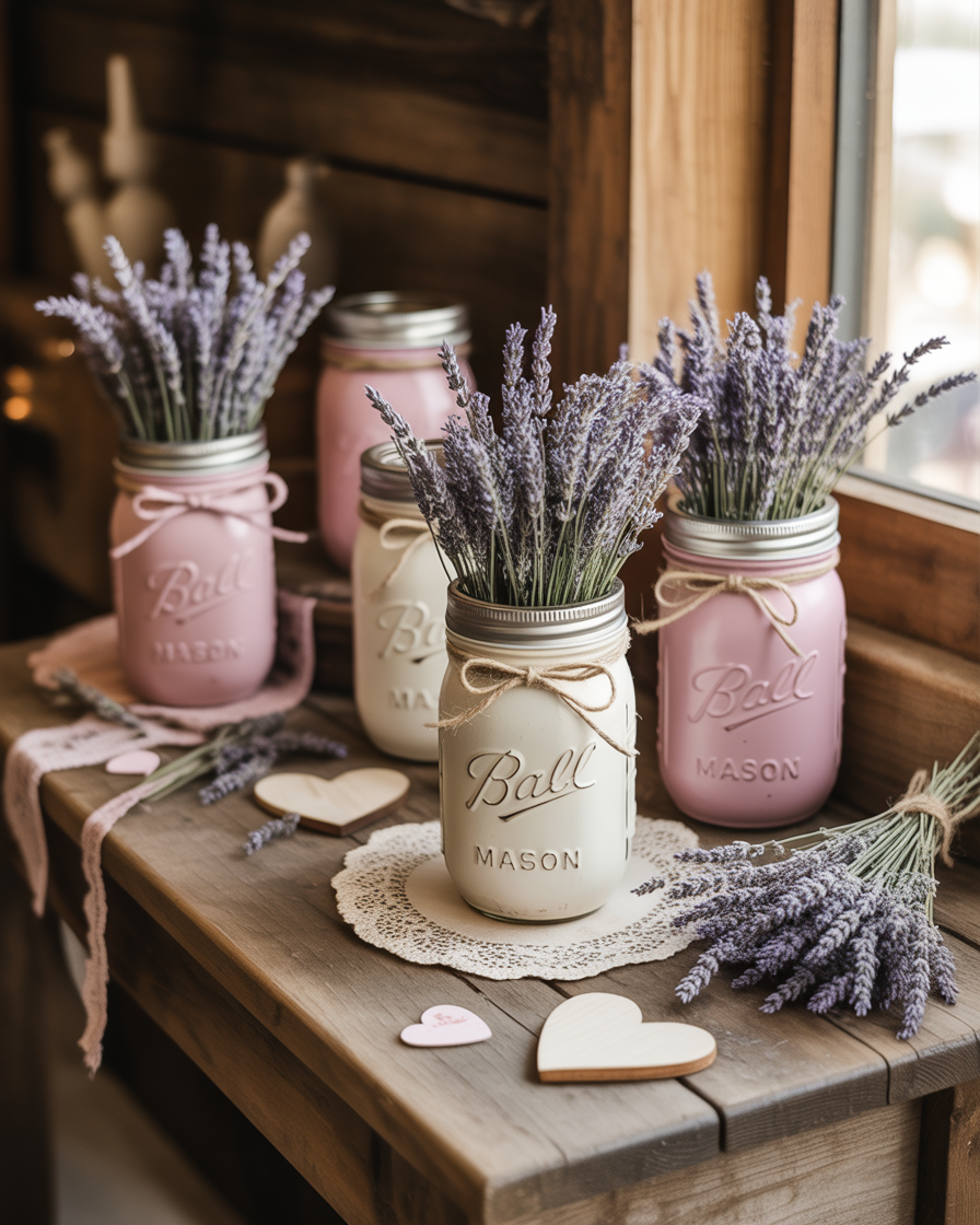 Nothing defines farmhouse creativity like simple DIY crafts. Collect Dollar Tree mason jars and paint them in neutral whites or soft pinks. Fill them with baby’s breath or dried lavender for easy Valentine’s decorative trays or mantle displays that look boutique-worthy but cost next to nothing.