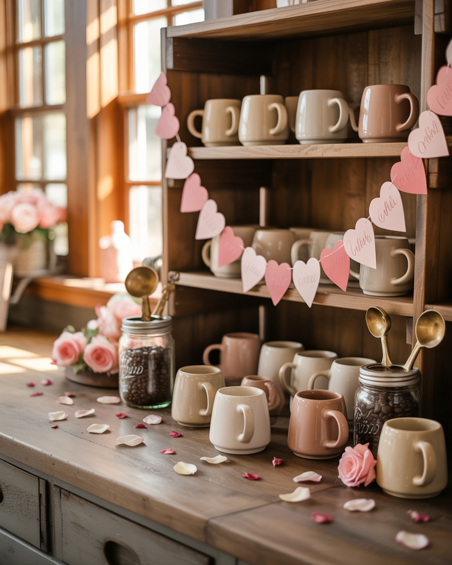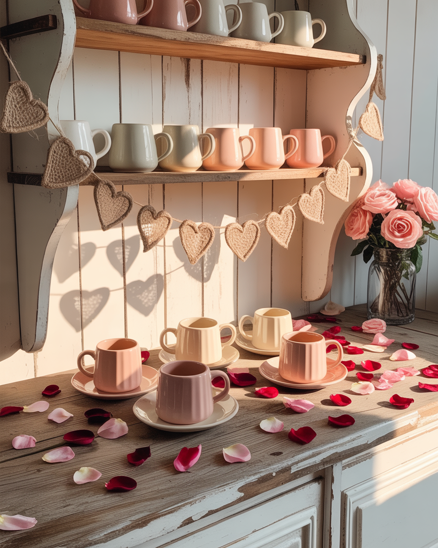 Transform your kitchen coffee station into a sweet Valentine’s nook. Use wooden shelves, white mugs with red lettering, and decorative trays lined with faux rose petals. Add a heart garland for a cozy rustic vibe that feels straight from a small-town café. It’s a fun DIY moment for coffee lovers and decorators alike.