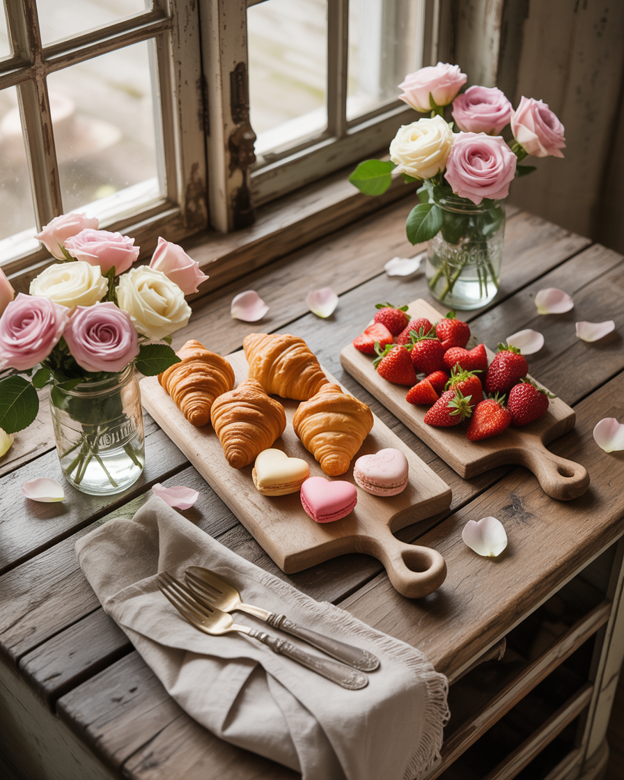 Celebrate love with a cozy breakfast corner inspired by French country charm. Use linen napkins, wooden cutting boards, and pale roses in a small vase. A decorative tray of pastries and coffee adds texture and romance without clutter — the perfect Valentine’s morning touch.