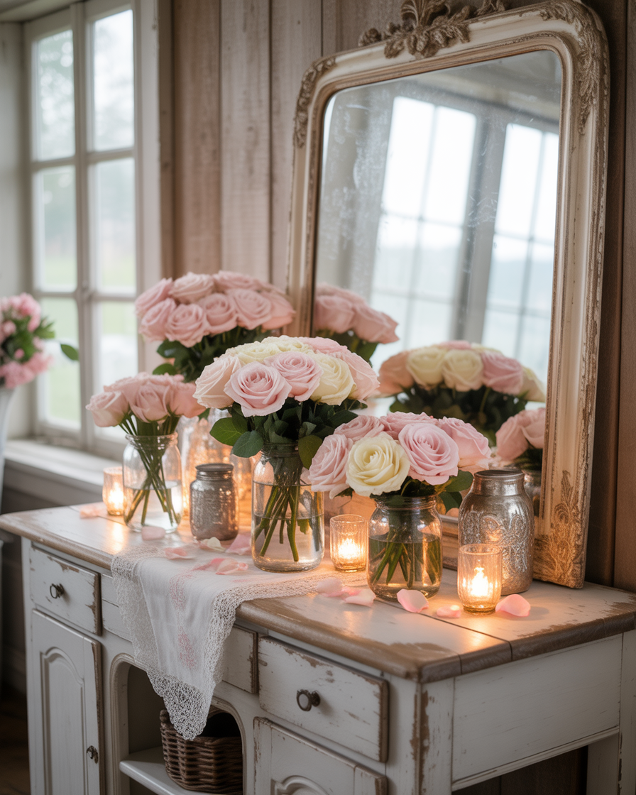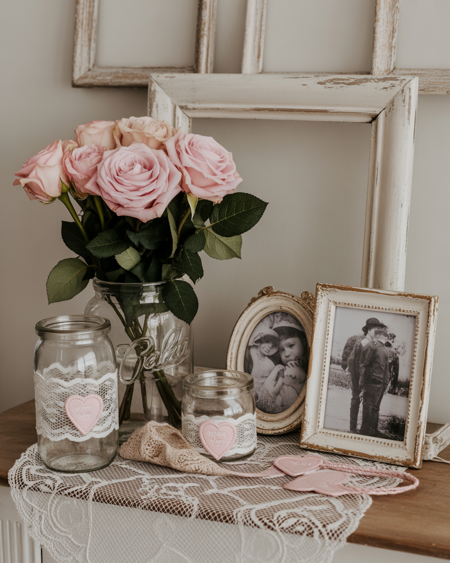 Mix vintage treasures with DIY crafts for a look that feels both nostalgic and fresh. Use lace doilies, old photo frames, and glass jars as vases for roses. Pair them with Dollar Tree finds like heart ornaments or faux pearls for a charming country touch that tells its own story.