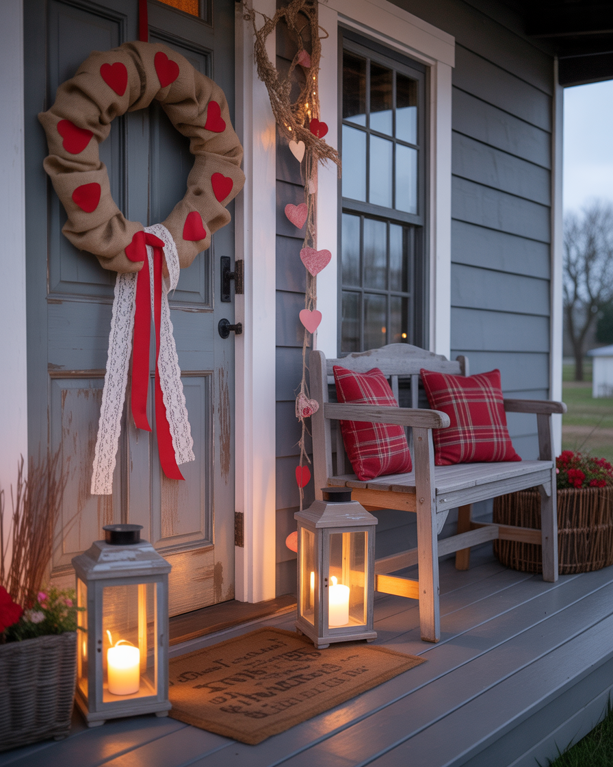 Welcome guests to your front porches with layers of rustic charm. Think distressed wooden benches, wreaths garlands made from burlap and twine, and vintage lanterns glowing softly. A simple “Love Lives Here” sign creates a beautiful farmhouse Valentine’s entryway that captures the magic of the season.
