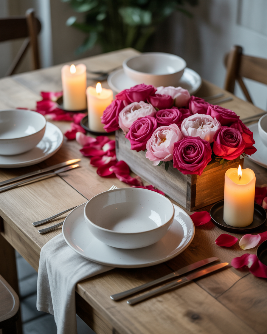 A modern farmhouse table decorated with minimalist touches can be both romantic and chic. Use white ceramic plates, linen napkins, and soft neutral runners accented by red roses. Add a decorative tray centerpiece with candles to complete a dining experience that feels effortlessly elegant.