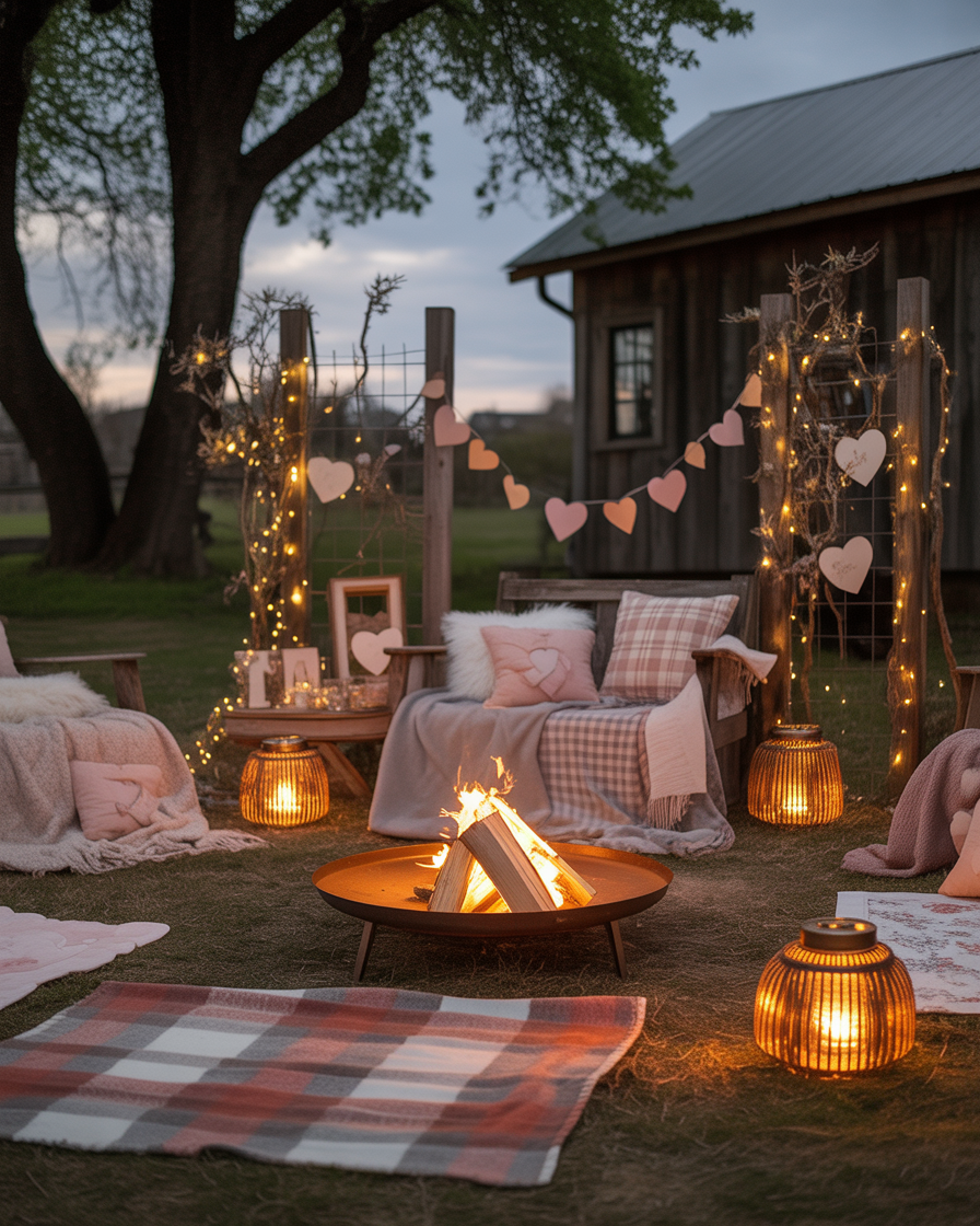 Bring love outside with an outdoor seating area framed by string lights and rustic heart signs. Add chunky knit blankets, lanterns, and a small fire pit for those cool February nights. It’s Valentine’s comfort made for real life, not just for photos.
