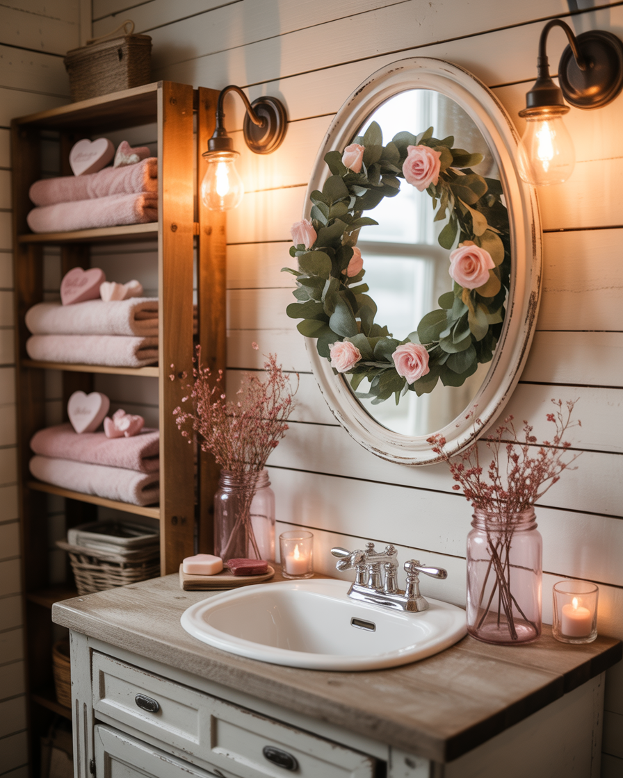 Even a country bathroom can join in the Valentine mood. Swap regular towels for blush and white ones, fill glass jars with rose-scented soaps, and place a small wreath garland above the mirror. These subtle, modern farmhouse touches turn a daily routine into something lovely.