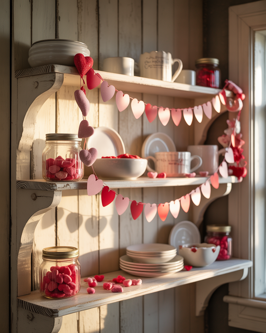 Open kitchen shelving can double as romantic art. Display white dishes, glass jars with red candies, and mini floral arrangements. A strand of heart-shaped wreaths garlands draped along the edge ties the whole look together — simple, modern, and perfectly country.