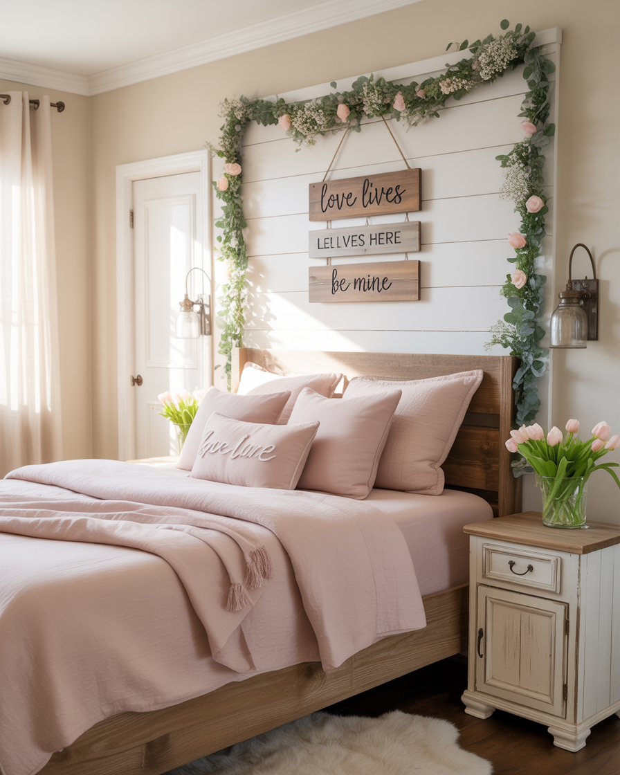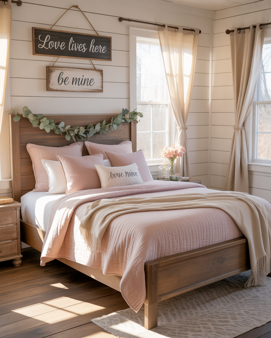 Turn master bedrooms into love-filled sanctuaries using layered quilts, blush pillows, and soft lighting. A simple wreath garland above the bed or a wooden “XOXO” sign captures that perfect Valentine’s mood while keeping your neutral farmhouse palette intact.