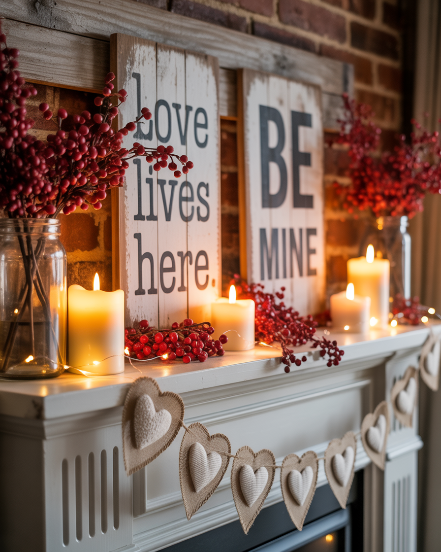 A rustic mantle adorned with Valentine’s Day decorations can be the highlight of an entire farmhouse. Create a cozy atmosphere by grouping rustic wooden signs with simple wreaths or garlands and placing some white candles around them. To enhance the sweetness of the country vibe, add some red berries or pink roses and top it all off with one or two DIY heart accents for a personal touch.