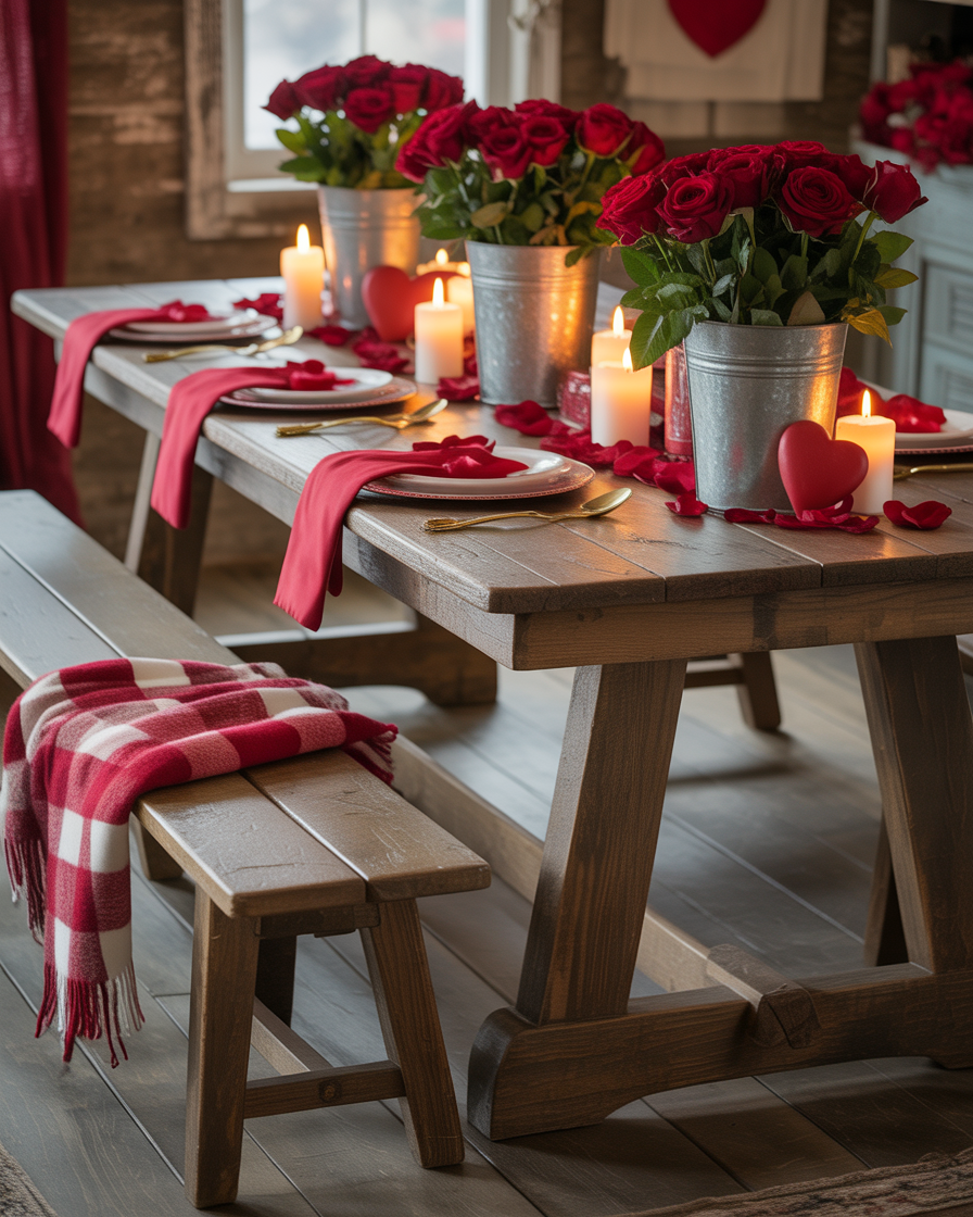 For a rustic table arrangement, use a long wooden bench layered with plaid throws and heart-shaped pillows. Add iron candleholders and a centerpiece of greenery for balance. This relaxed country vibe invites guests to linger over a Valentine meal full of warmth.