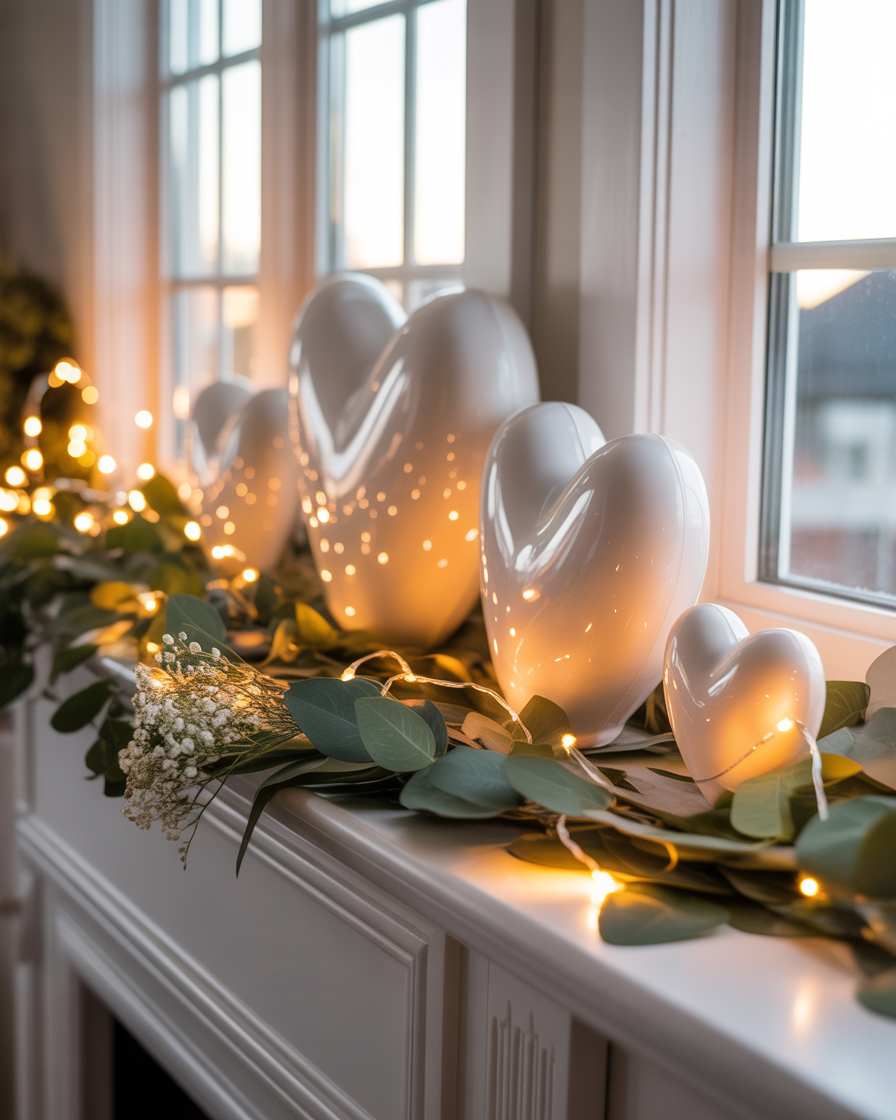 Recreate a Target-inspired mantle display using affordable Valentine’s finds. Combine white ceramic hearts, small wreaths garlands, and faux greenery for that modern farmhouse finish. It’s an easy way to get a designer look using budget-friendly pieces.