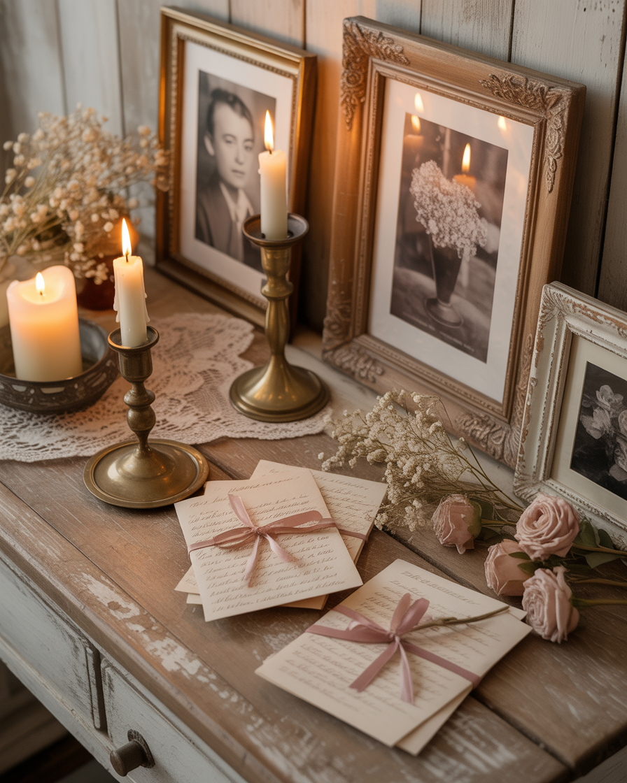 Add nostalgic charm by framing handwritten notes or vintage Valentine cards. Display them on a distressed wood wall or mantle next to soft candles and lace details. This vintage farmhouse Valentine’s idea adds personal history and warmth that no store-bought decor can replace.