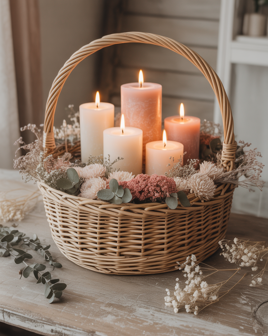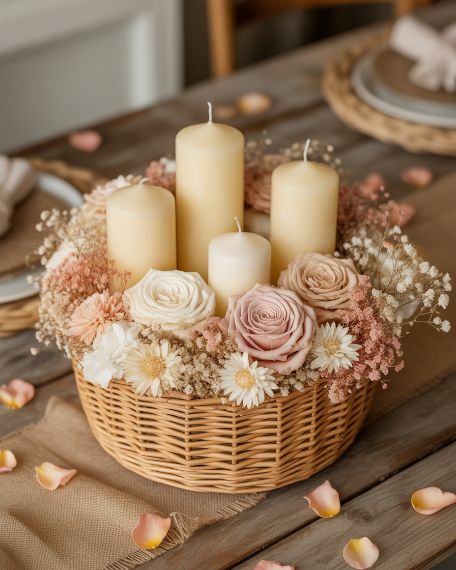 Head to Walmart for a neutral Valentine’s centerpiece idea — think woven baskets, dried florals, and cream candles. Add subtle heart motifs to keep it romantic but understated, perfect for modern farmhouse homes that value simplicity.