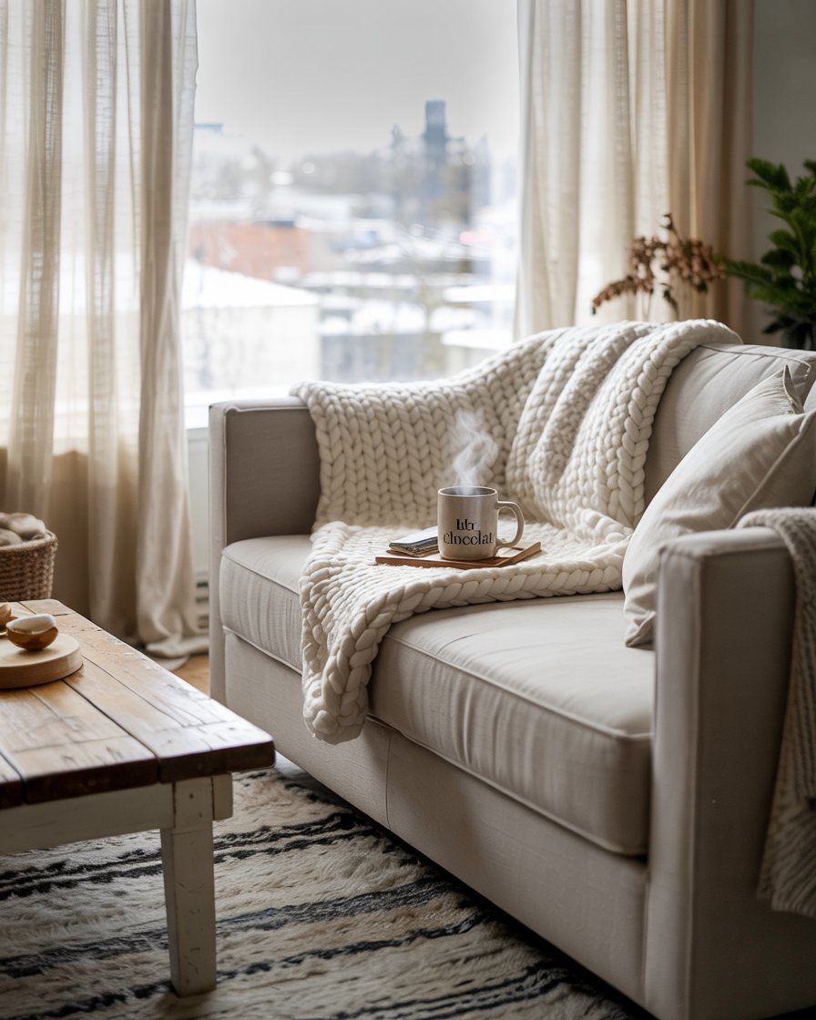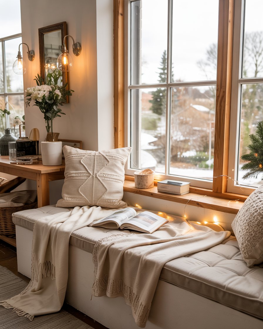 Turn a forgotten window nook into a cozy winter escape. Add a thick cushion, rustic wool blankets, and elegant sconces or fairy lights. This idea suits living rooms apartment or cottage homes with alcoves. Designers often emphasize layering textiles to create a cocooning effect. It’s perfect for reading on cold January afternoons, bridging fall and winter moods beautifully.