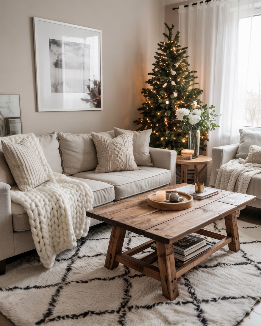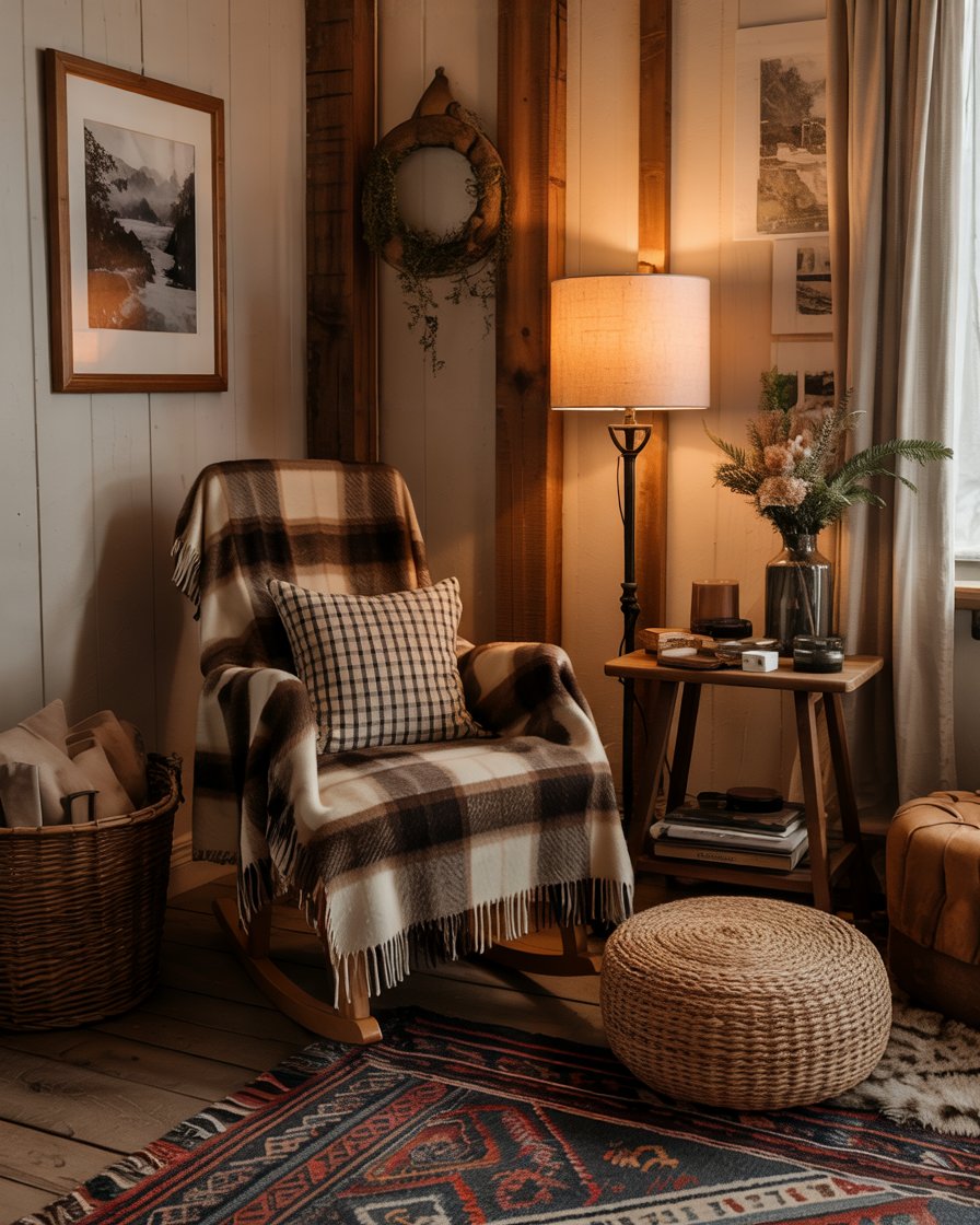 For those who love cabin vibes, turn one corner of the living rooms into a cozy retreat. Introduce plaid blankets, a rocking chair, rustic wood accents, and a vintage floor lamp. The fall and winter textures complement each other with this one, extending the warmth of the season well past Christmas. Most design experts recommend that winter is the perfect time and occasion for the creation of layered zones like this for unwinding in the dark evenings-it synergizes nostalgia and functionality perfectly.