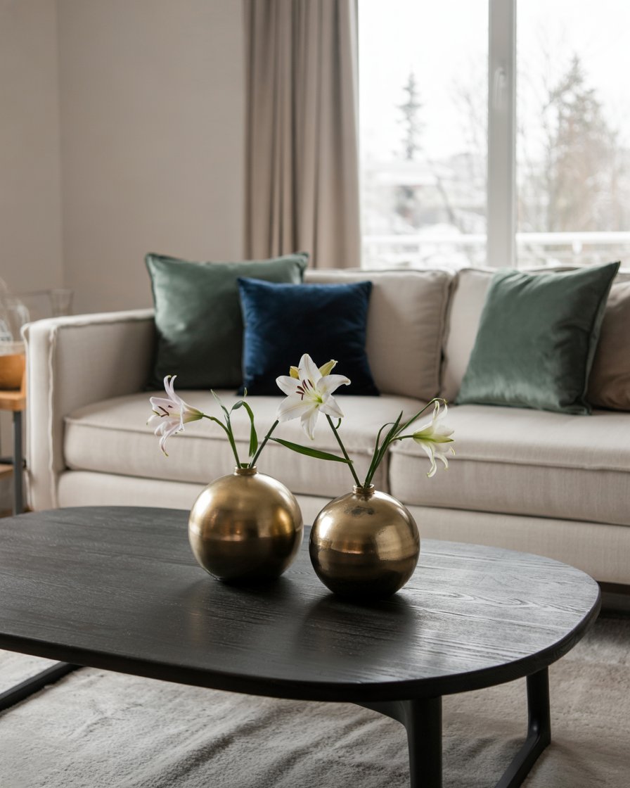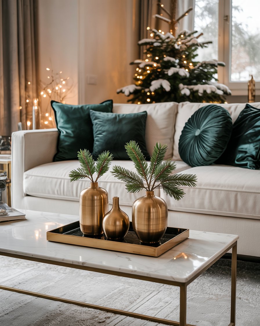 Enter jewel tones if your living rooms modern crave some boldness in January-green, sapphire, and amethyst. These colors instantly warm up neutral spaces and look stunning under winter light. Pair velvet cushions with elegant metallic accessories for a luxe touch. Designers like Nate Berkus recommend using jewel tones sparingly to avoid overwhelming smaller living rooms apartment. It’s a sophisticated creative way to shift your decor from festive Christmas into a refined winter aesthetic.