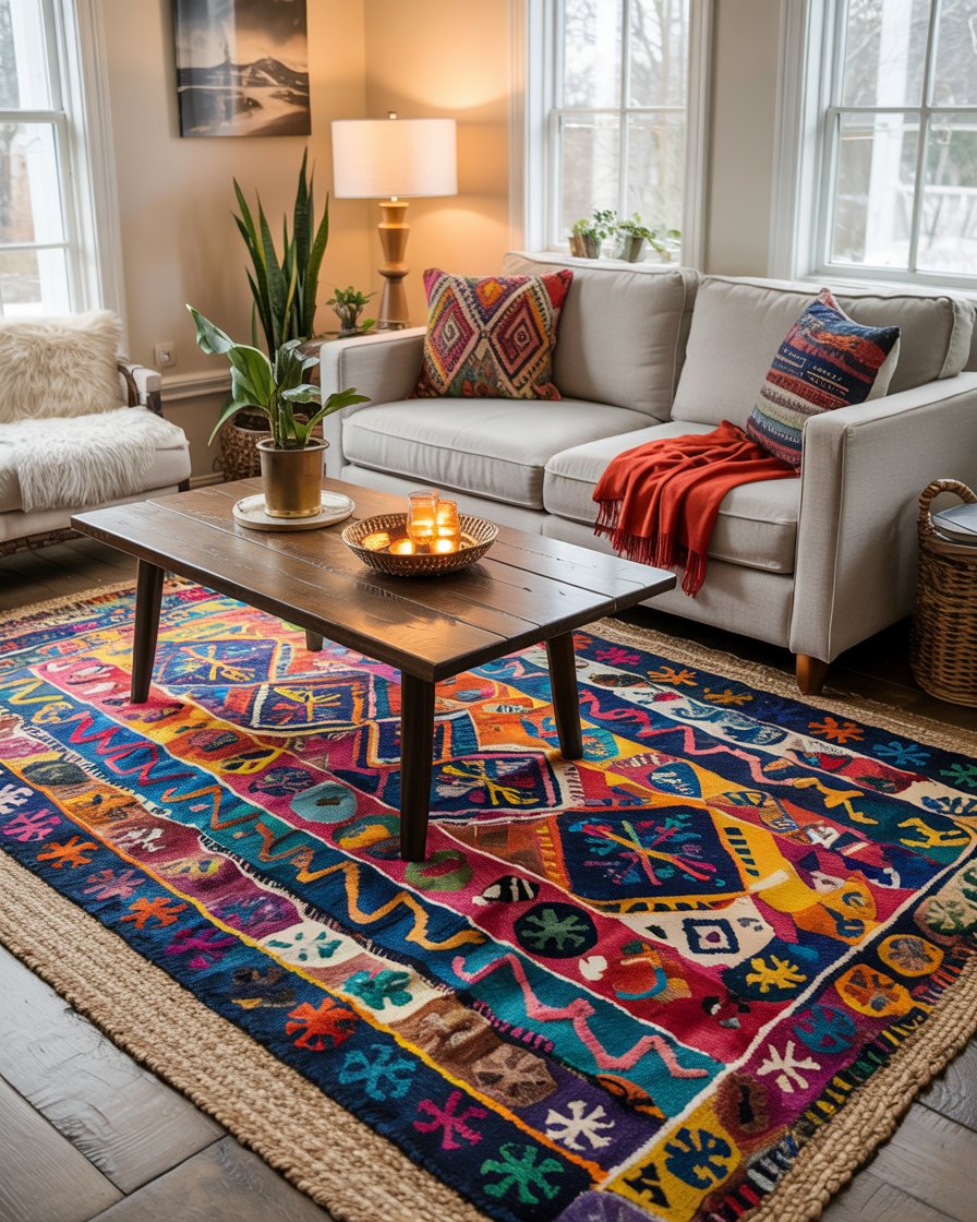 The boho layered rugs are wonderful for adding depth and personality to living rooms during the winter. Mix and match patterns and textures that go well together-a vintage kilim tray over a jute base-to create a cozy layered effect. This approach works well in living rooms apartment where floors feel bare after Christmas decor is packed away. Designers like Amber Lewis often layer rugs to balance warmth with visual interest, making this idea both creative and practical.
