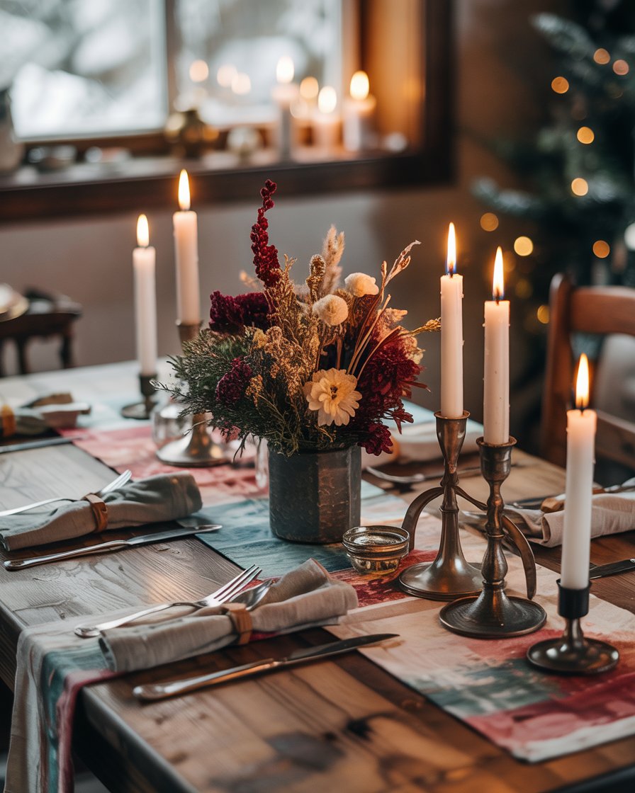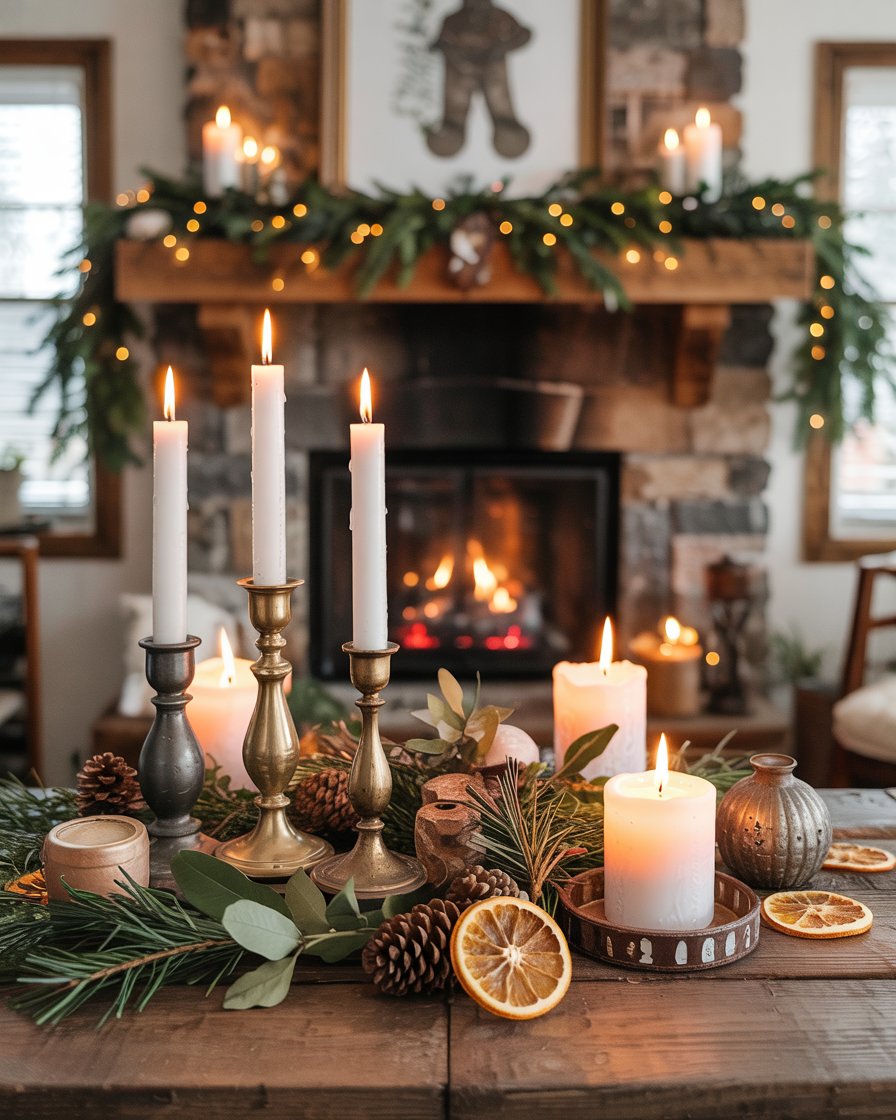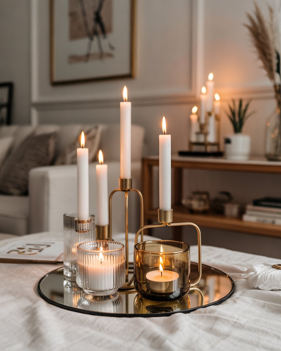 Nothing sets a cozy winter mood like clusters of elegant candles. Group taper candles of varying heights on trays or mirrored bases for a sophisticated glow. Use brass or glass holders to elevate the look. This idea suits both living rooms modern and Rustic farmhouse interiors, seamlessly transitioning past Christmas into the deep winter months. Experts often note that candlelight adds instant intimacy to even the most minimalist spaces.
