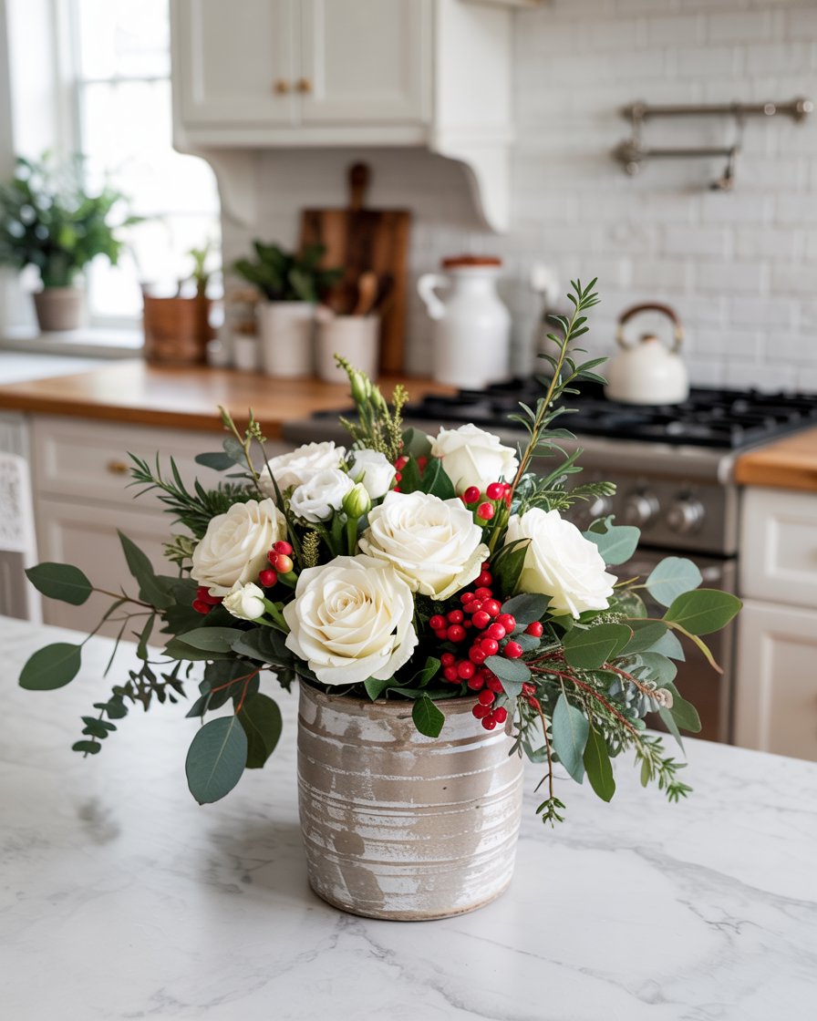 Move beyond poinsettias with creative post Christmas floral arrangements. Combine white roses, greenery, and berries in glass or stoneware vases for a fresh yet elegant look. This idea works in living rooms, entryways, or kitchen islands. Florists recommend adding dried seed pods or eucalyptus for longevity. It’s a chic way to bring life indoors during deep winter.
