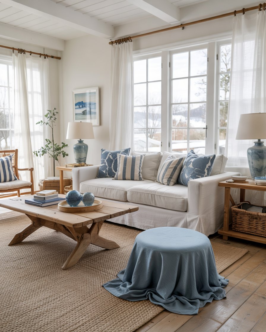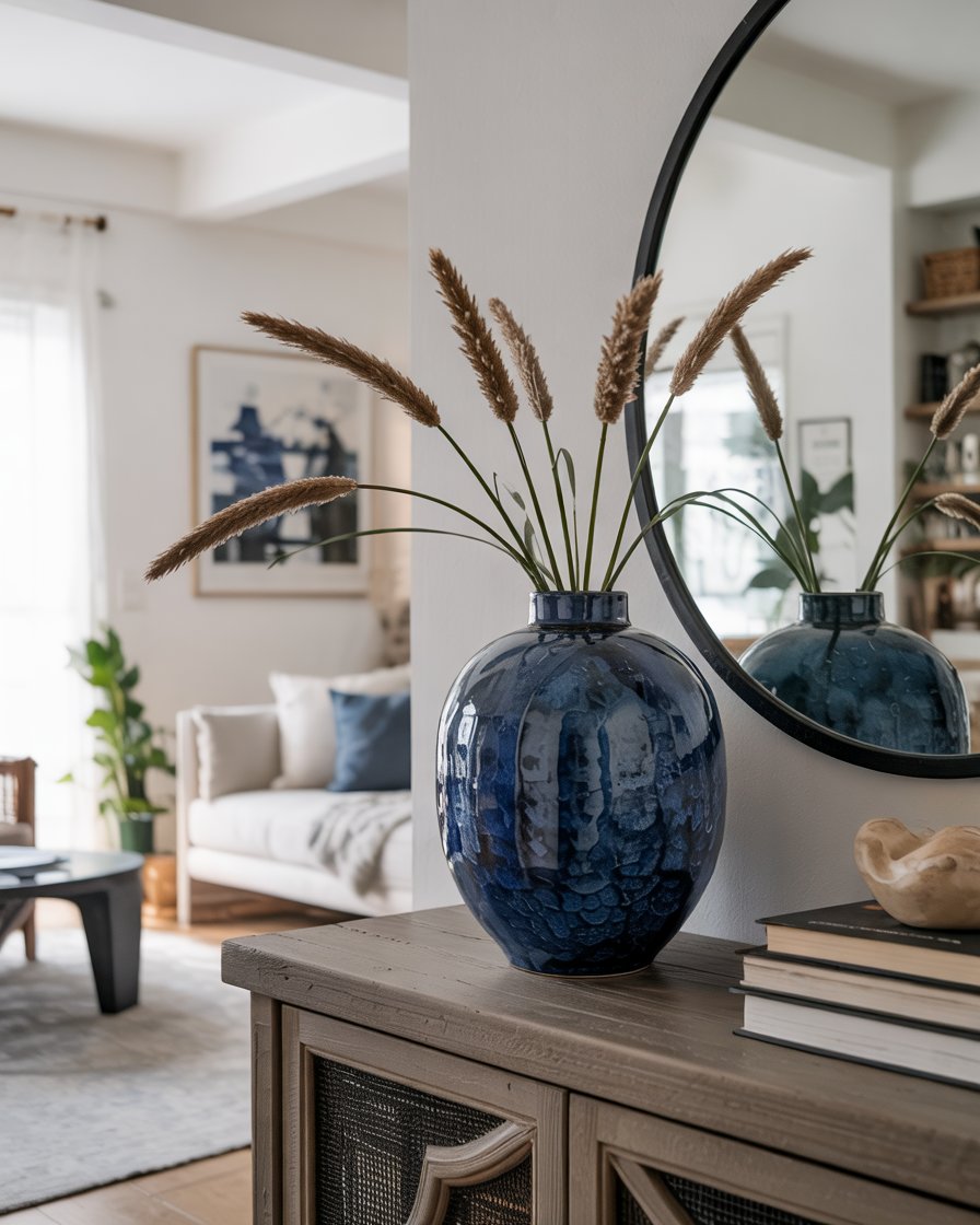 Incorporating blue ceramic vases, bowls, or lamps brings a refreshing modern touch to rustic interiors during January. Place these pieces on consoles, mantles, or kitchen counters for a vibrant focal point. This creative accent works well in both coastal and Rustic farmhouse settings. Designers often suggest using just a few bold ceramics rather than many small items to maintain elegance and impact.