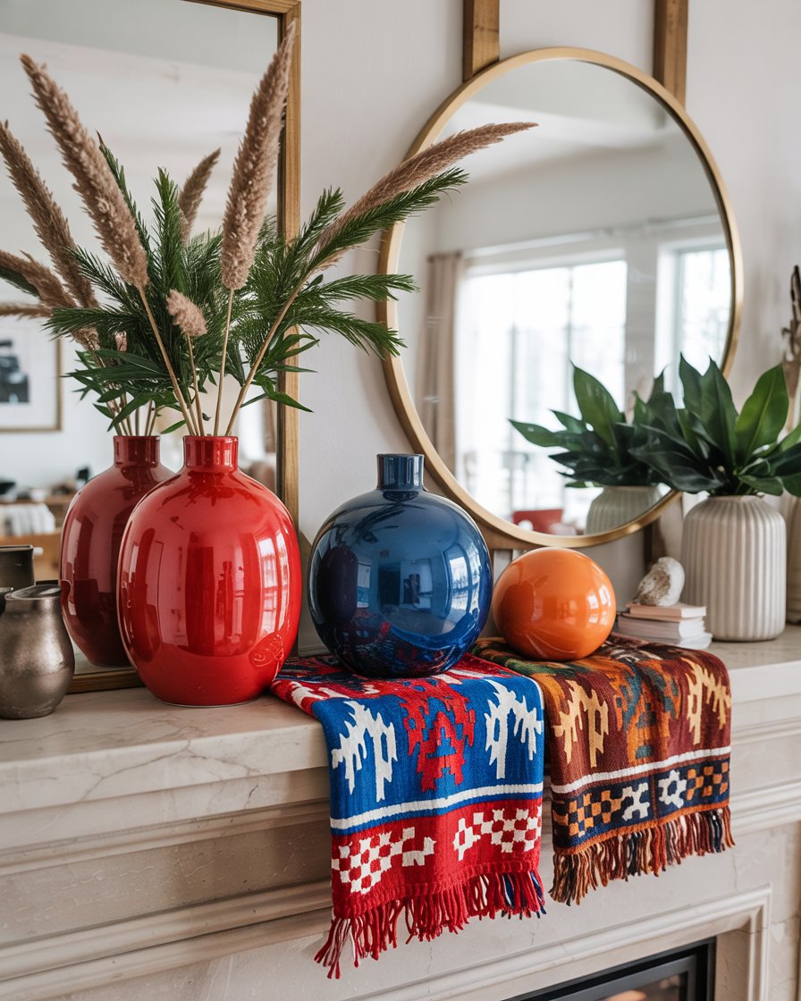 For homes with a mantle, consider adding bright pops of color through seasonal vases, textiles, or artwork. A modern twist on rustic winter decor, this idea replaces garlands with bold ceramics, patterned fabrics, and layered mirrors. Influencers like Chris Loves Julia showcase how vibrant accents breathe new life into living rooms fireplace zones long after Christmas. It’s daring, creative, and refreshingly unexpected.