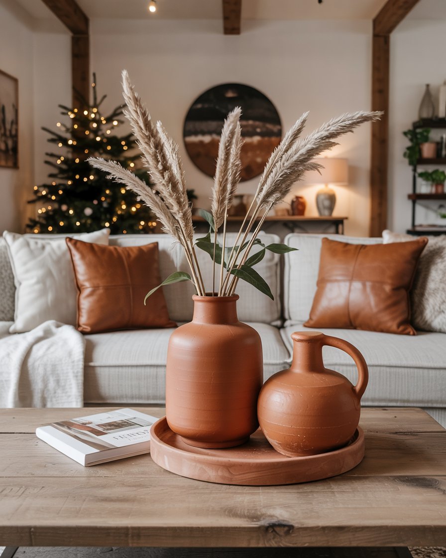 Terracotta is making a comeback for living rooms cozy and modern interiors this winter. Swap out cool tones for terracotta vases, throw pillows, and pottery to introduce a rustic farmhouse warmth. The earthy hue pairs beautifully with neutral walls and wooden textures. Influencers on videos on YouTube often highlight terracotta as a transitional post Christmas color that bridges fall and winter seamlessly, giving interiors a grounded yet inviting look.