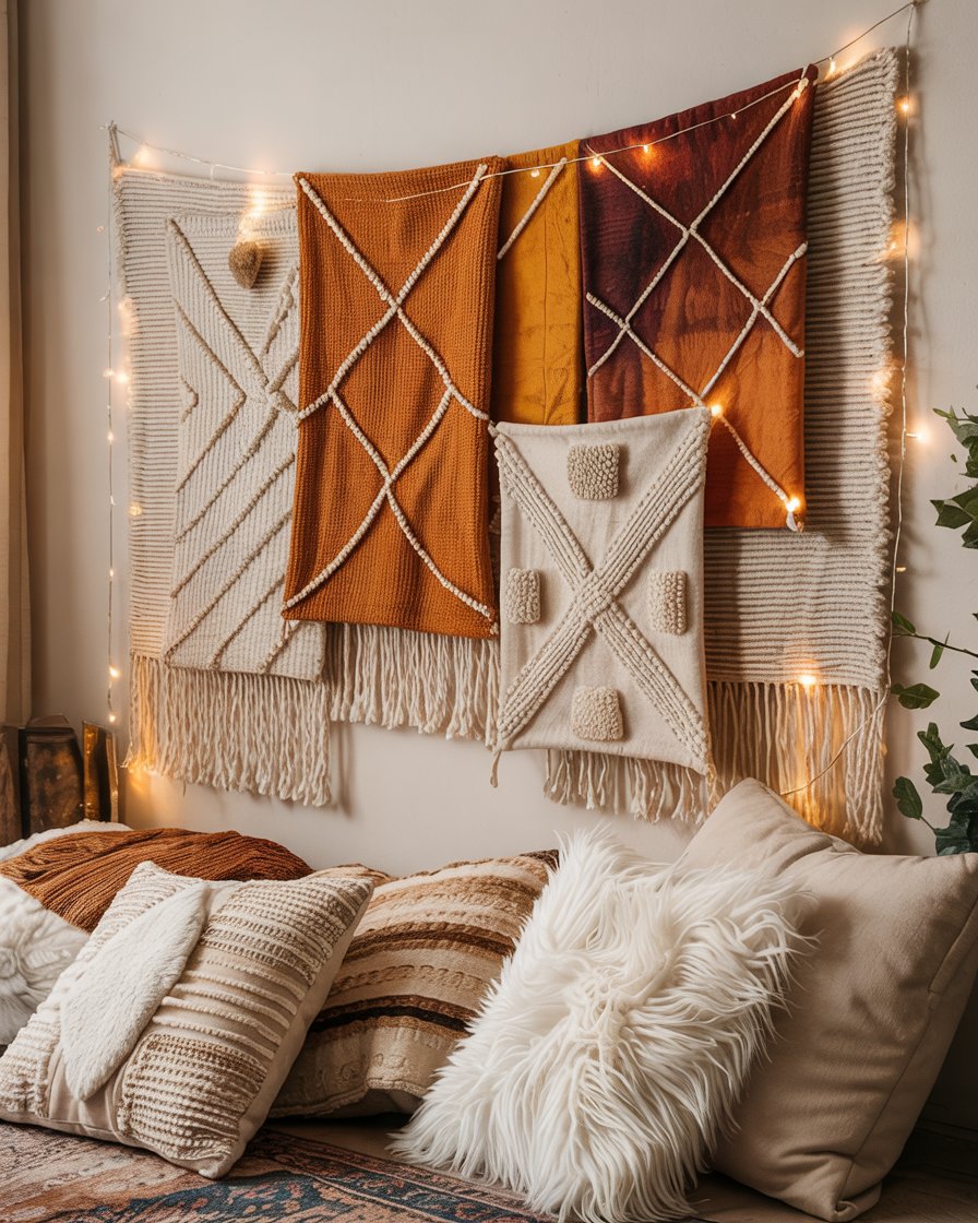 For a boho twist on winter decorating, hang layered tapestries or woven wall hangings in warm tones. This works wonderfully in living rooms apartment and cottage homes, adding texture and personality without clutter. Pair with fairy lights or sconces for a soft elegant glow. Designers like Justina Blakeney often use tapestries to create focal points that feel both cozy and expressive during the colder months.
