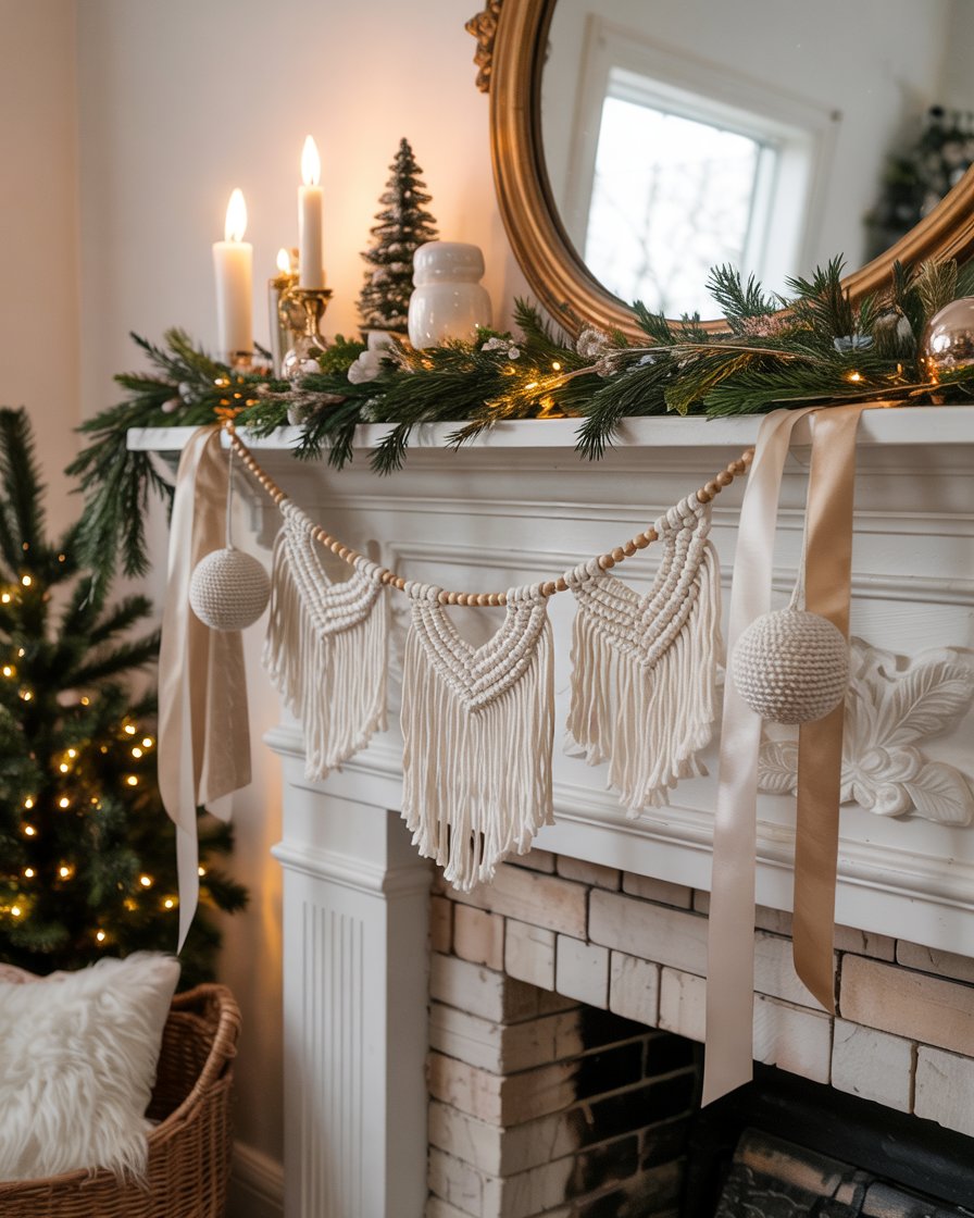 Instead of traditional garlands, try fabric drapes, beaded strands, or diy macrame across your mantle for a creative winter look. This idea suits living rooms fireplace zones where greenery might have dried out post-holidays. Mixing boho textures and elegant materials like satin ribbons or metallic beads gives a unique winter vibe. It’s an inventive way to decorate without repeating classic Christmas styles.