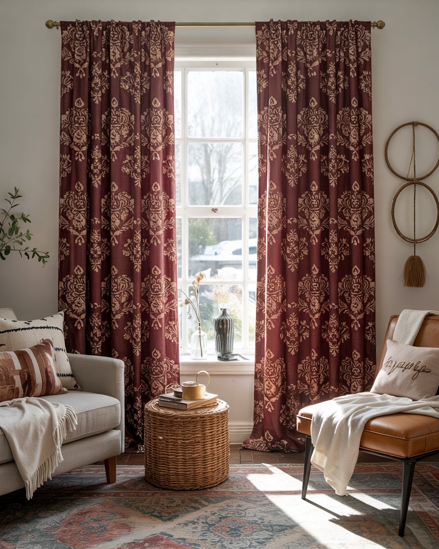 Winter is a great time to switch out sheer drapes for elegant patterned curtains in jewel tones or earthy colors. They add instant warmth and act as a statement piece in living rooms modern, cottage, or Rustic farmhouse interiors. Patterns like damask, paisley, or block prints work well. Experts suggest floor-length curtains to emphasize verticality and create a cozy atmosphere during darker months.