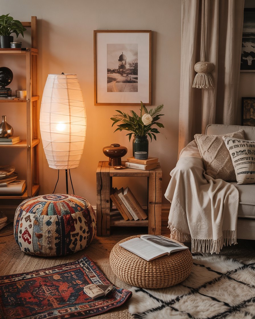 Create intimate reading nooks by combining vintage floor lamps, textured rugs, and rustic wood accents. This idea suits living rooms apartment, cabin, or cottage spaces beautifully. Add a boho patterned chair or pouf for personality. Many design experts recommend layering warm light sources in January to offset shorter days and build a cozy atmosphere that feels timeless and personal.