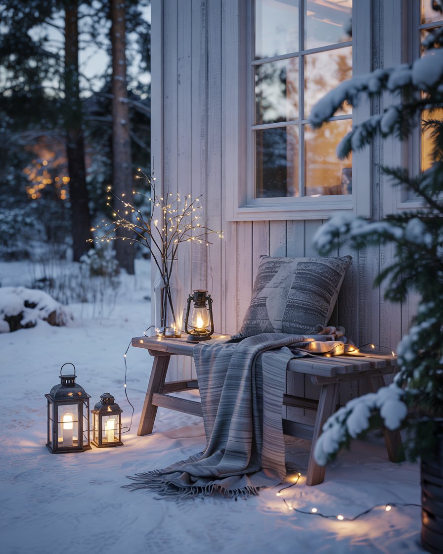 Brighten the outside of your home with Scandinavian-style winter lighting. Use clusters of lanterns, warm string lights, and simple wooden accents to create an elegant yet understated look. This style works well for porches, patios, or cottage entrances. Influencers often emphasize soft light and minimal decoration, making it a calming post Christmas option that lasts through January.