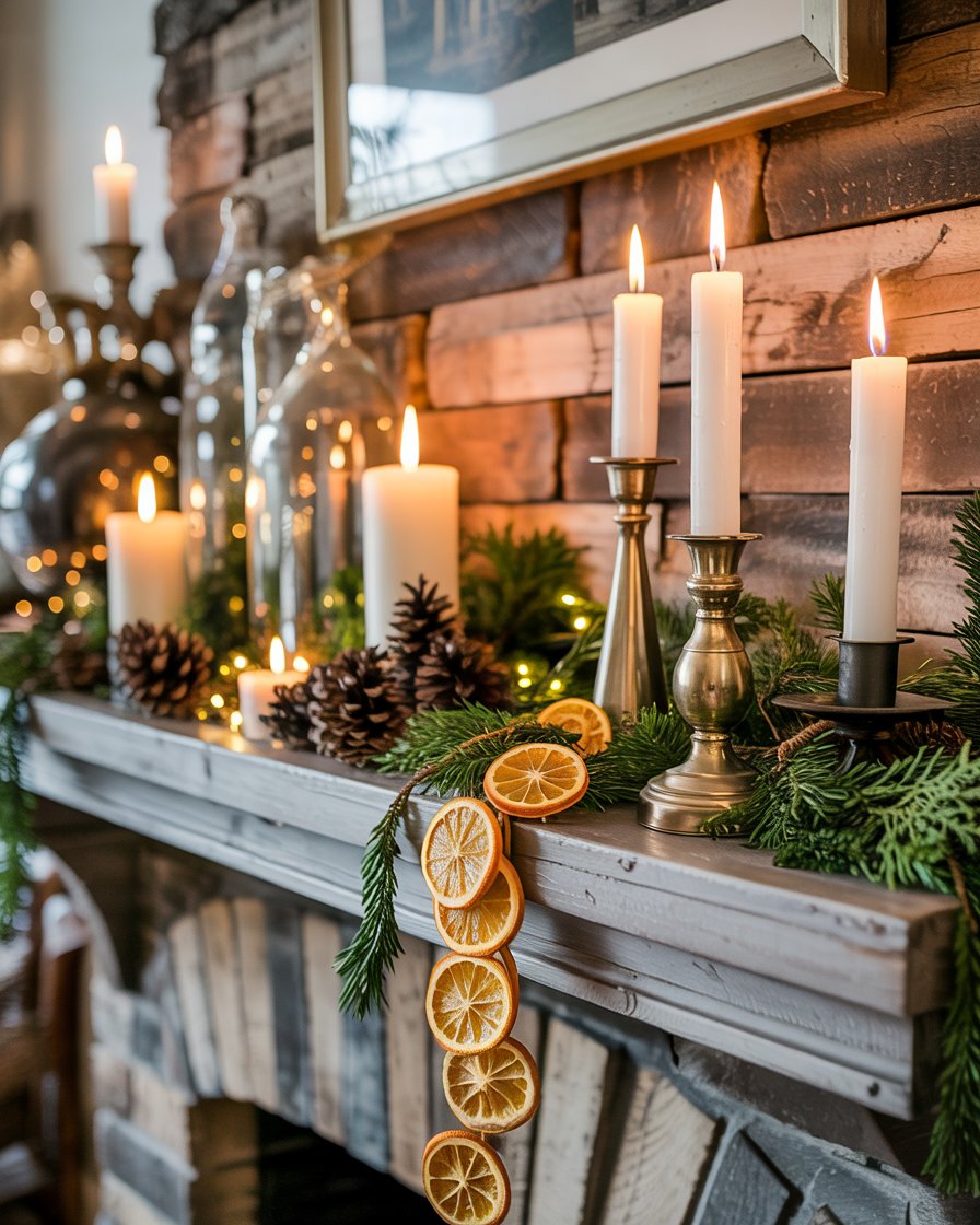 Mantles are the winter decor star when filled with rustic beauty. Layer garlands of dried orange slices, pinecones, and vintage candlesticks for a vintage yet creative display. It looks beautiful in living room fireplaces and takes over the hearth as the Christmas decoration after the holidays. The juxtaposition of natural and found elements gives a rustic-shack charm that feels timeless into January, as seen in Leanne Ford’s projects.
