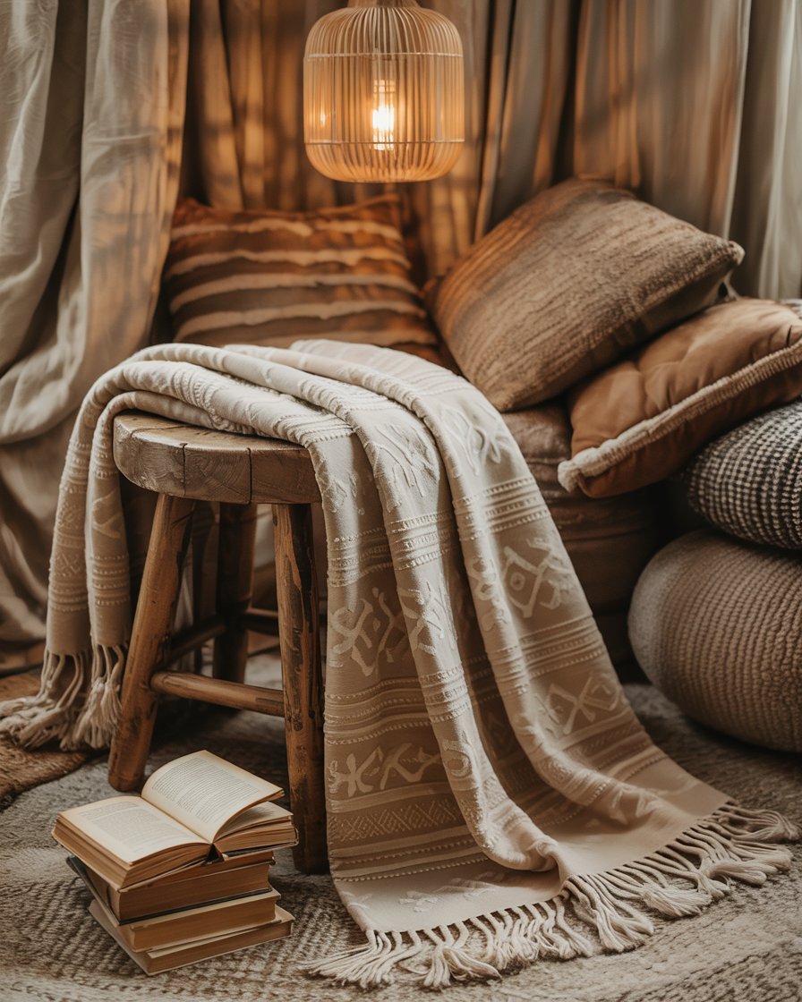 Creating warm and personified boho winter nooks for the unassuming corners. Layer floor cushions, rustic stools, and patterned throws in earth tones for that lax coziest feel. Follow them up with hanging lanterns or fairy lights for an extra ambiance. A living room or cottage area is the main place for this idea to shine when organic textures are involved. Designer Justina Blakeney advises embracing creative textiles and natural motifs to make these corners feel inviting through January.