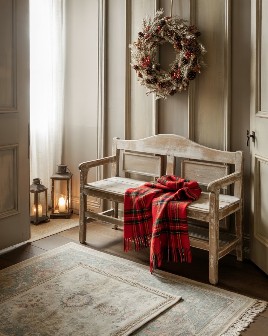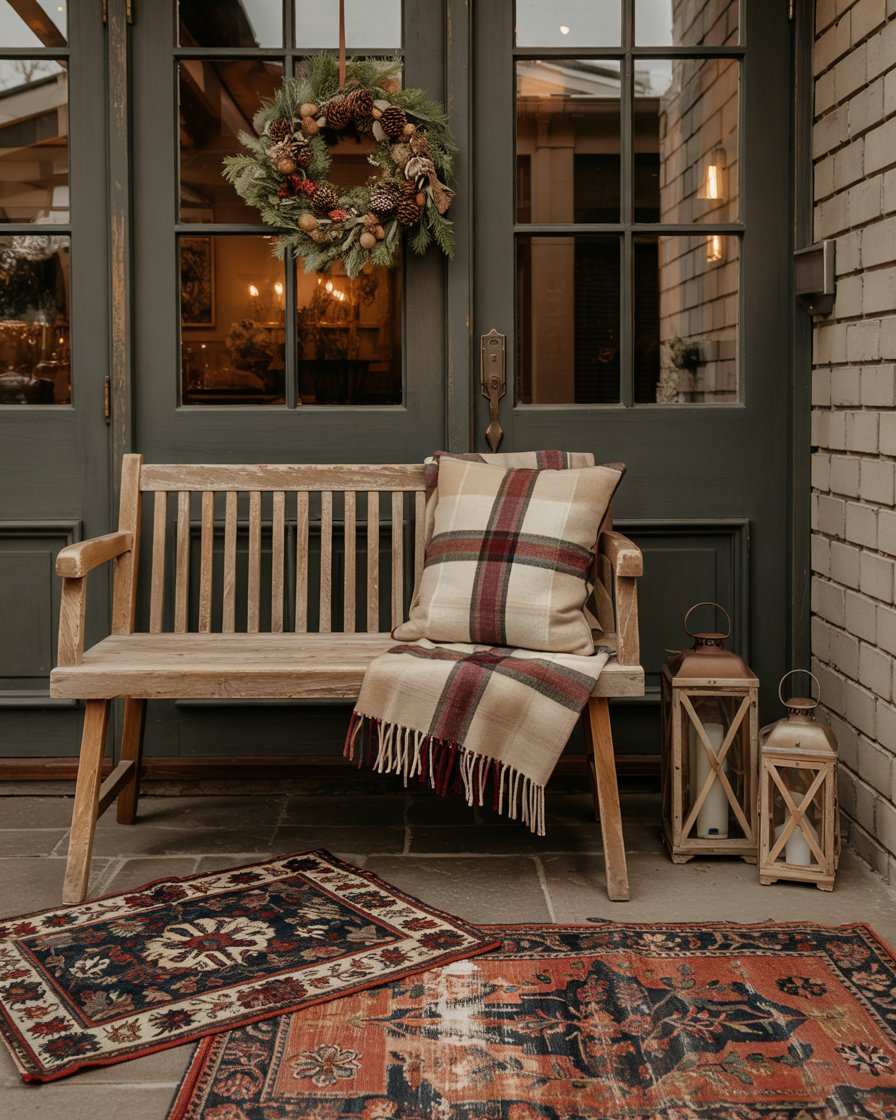 First impressions matter. An elegant winter entryway featuring a wooden bench, layered rugs, and dried wreaths sets a welcoming tone. This idea blends rustic farmhouse character with modern simplicity. Add outside lanterns to extend the decor beyond the door. As Apartment Therapy designers note, using seasonal greenery and cozy textures in entryways creates continuity with the rest of the home.